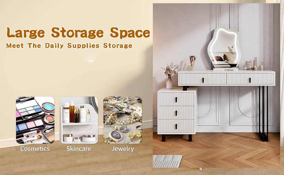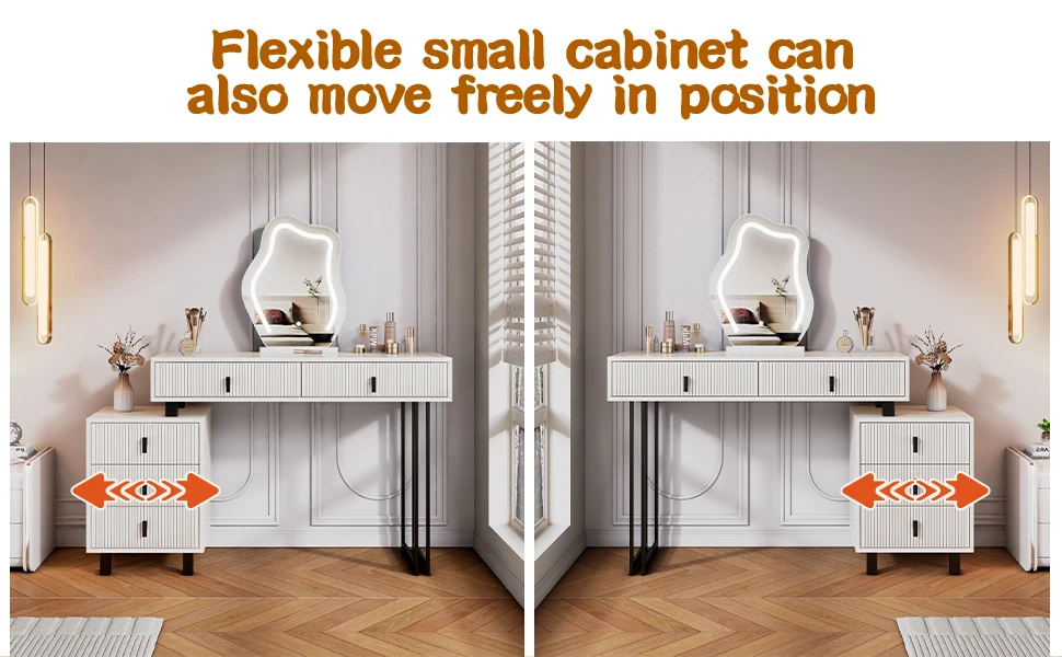 2. Extendable Side Cabinet: The vanity and desk combo offers a versatile side cabinet that can be adjusted from 35.43" to 46", allowing you to customize the length of the modern vanity to fit your space. The side cabinet also serves as a great spot to store small essentials, maximizing space in any room.