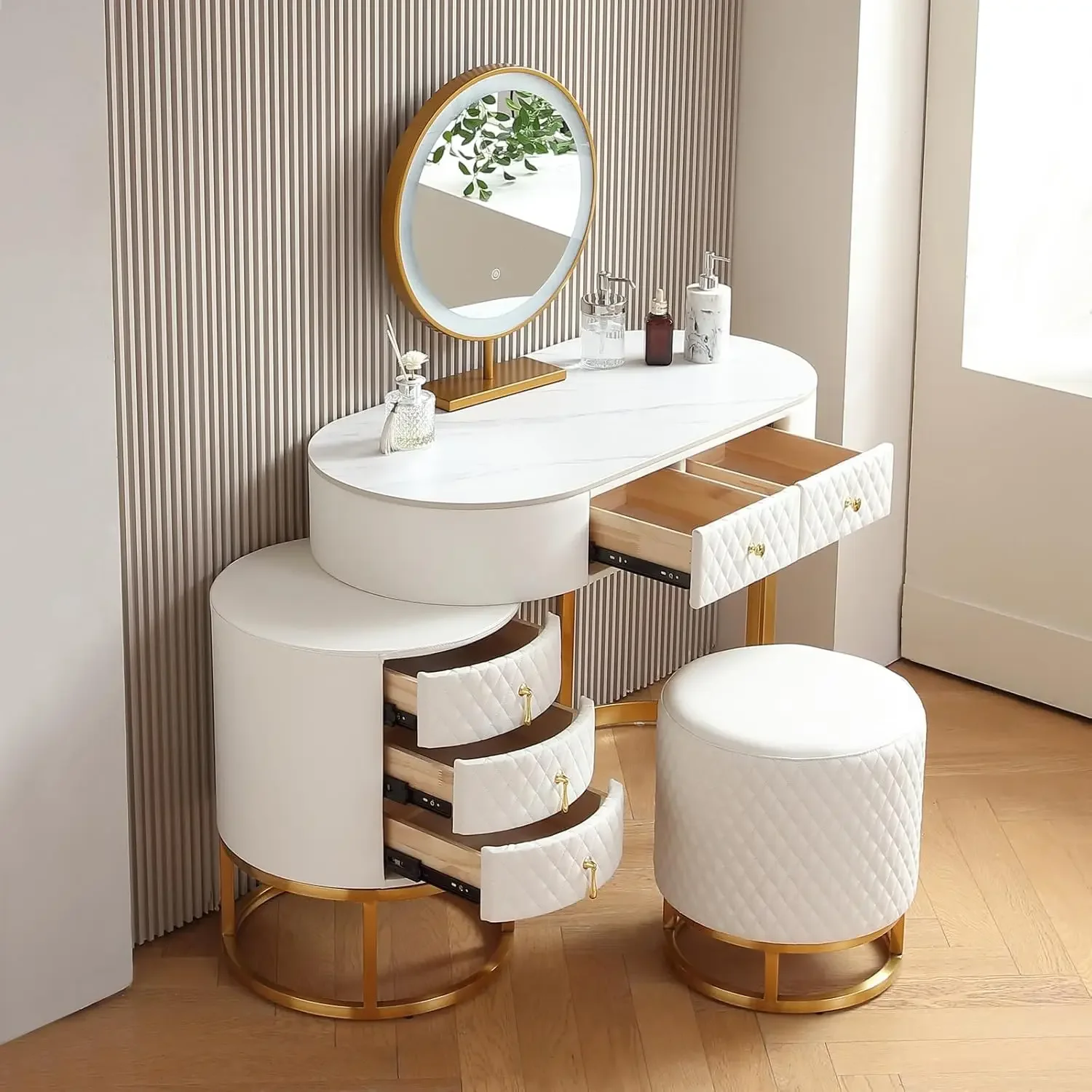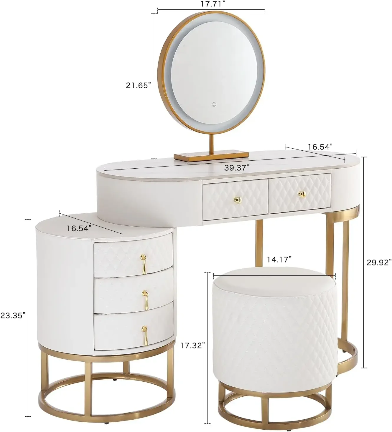 Faux Leather Makeup Vanity Desk Set with LED Lighted Mirror Luxury Dressing Makeup Table with Storage Drawers & Vanity Stool