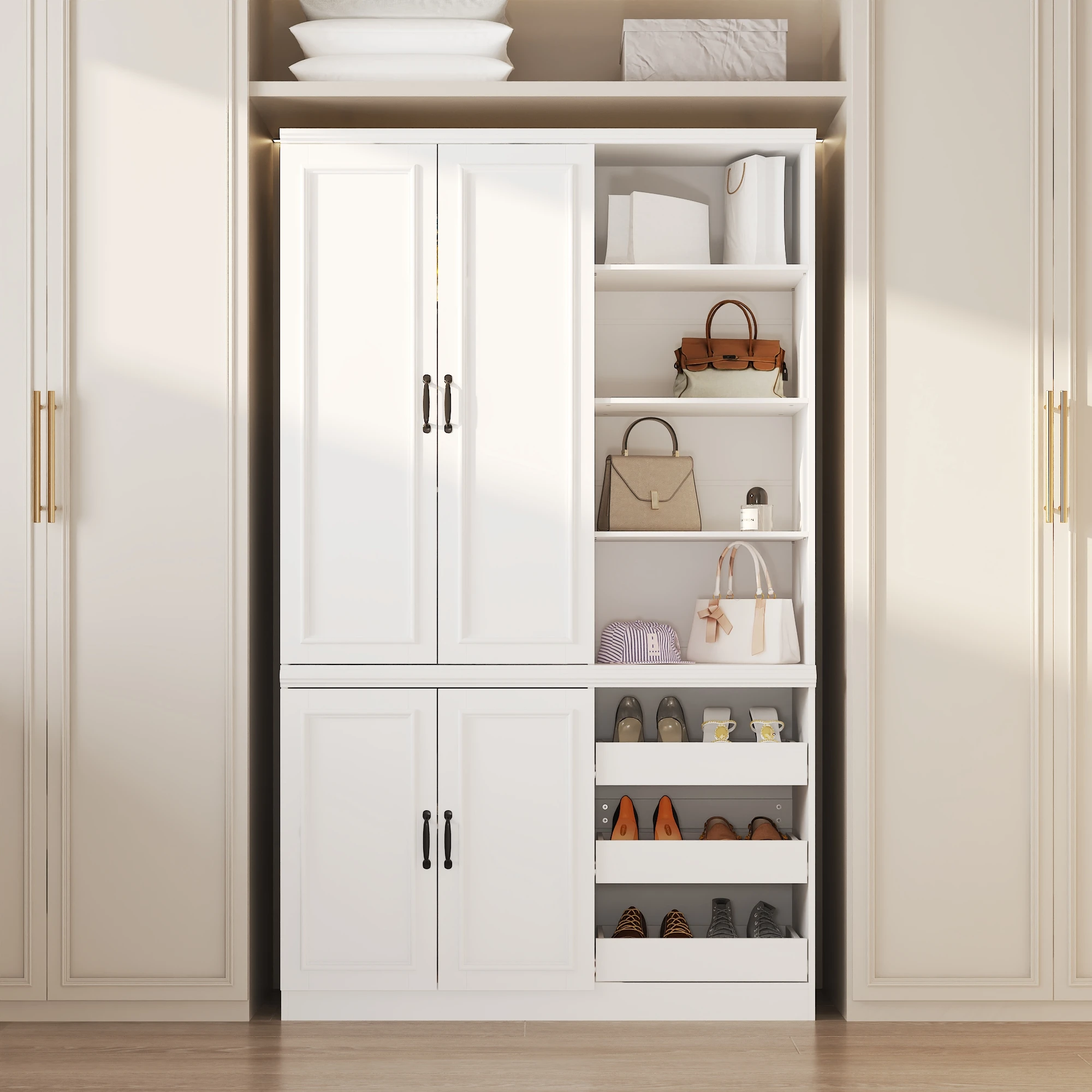 This elegant white wardrobe is a multifunctional and practical storage solution designed specifically for bedrooms, perfectly blending style and practicality. This closet system is equipped with open shelves and hidden shelves, providing ample space for organizing various items while maintaining a neat and orderly appearance. Adjustable shelves allow customization according to individual needs, ensuring that each item has a designated location.