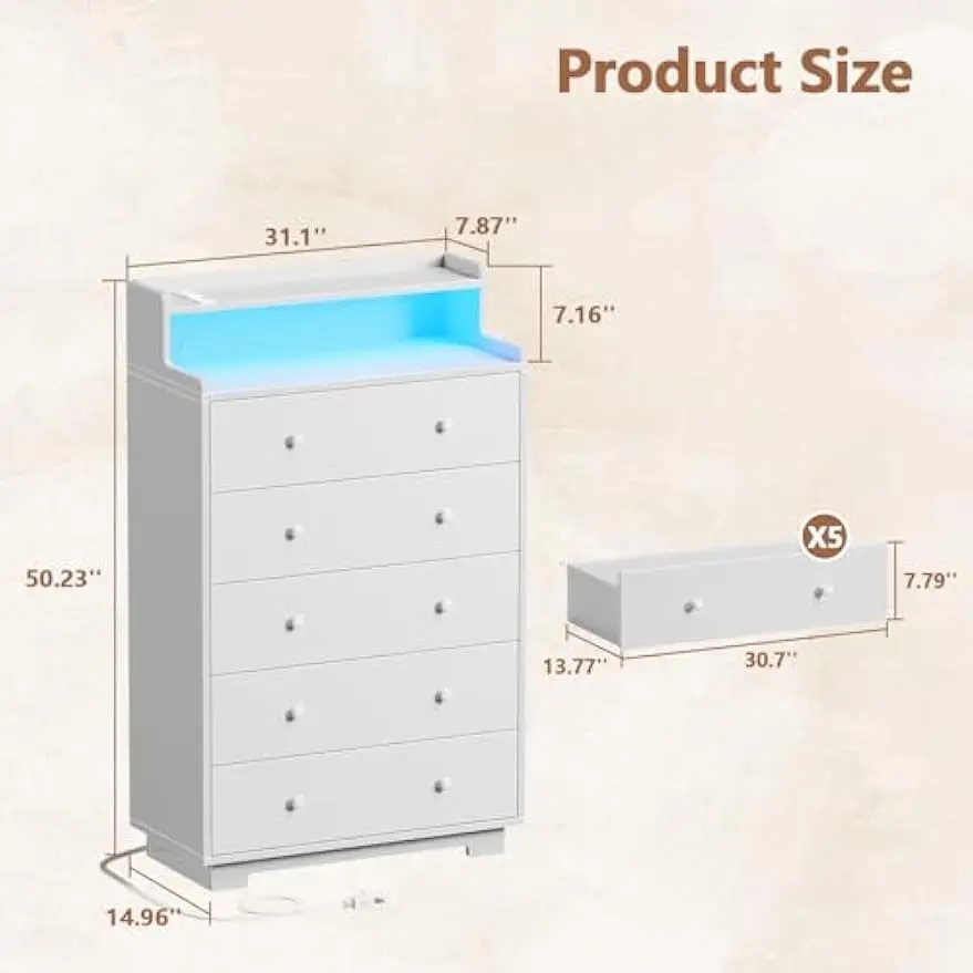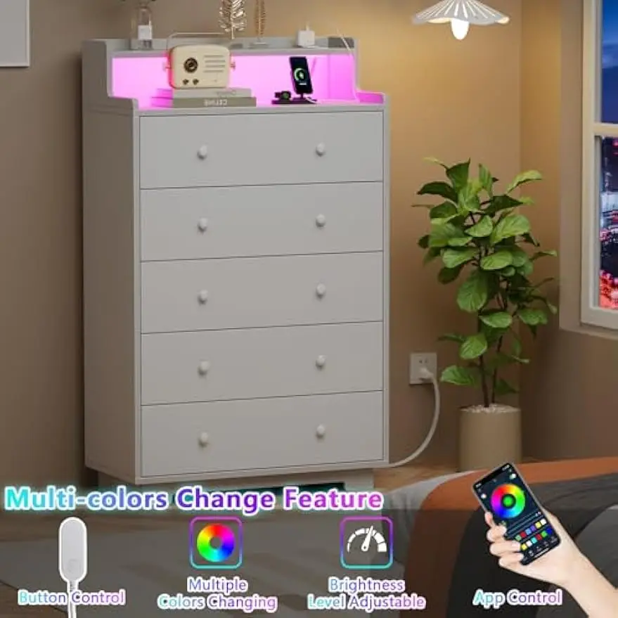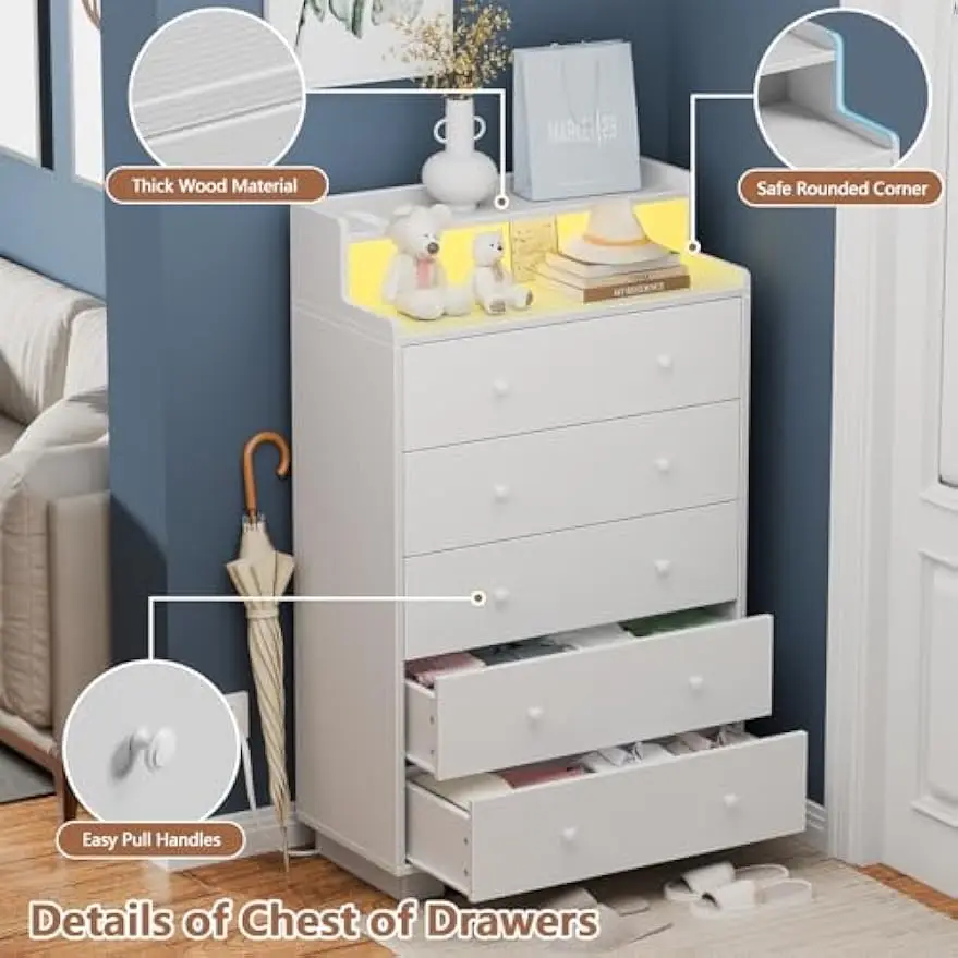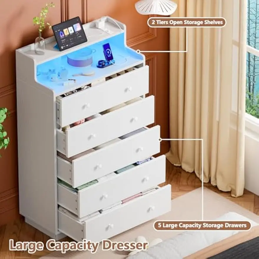 Tall Chest of Drawers for Bedroom,5 Drawer Dresser with Charging Station and LED Light,Wood Deep Slide Drawer for Clothes,Blanket in Living Room, Closet,Entryway,White Dresser