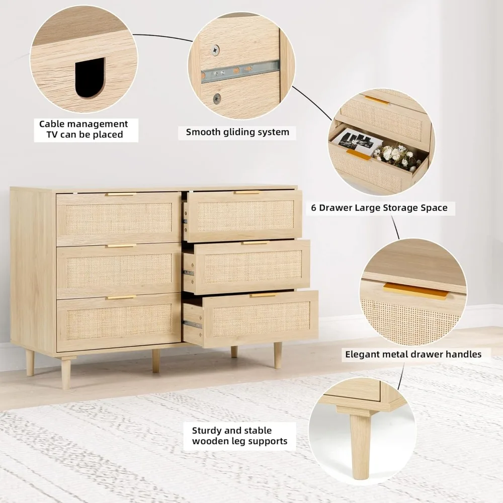 【Clothes Organizer】 Dresser oak size: 43.3 "W x 15.7" D x 29.5" H. Size of each drawer: 19.5 "W x 5.1" D x 10.4" H. With six drawer capacity, it can be used in multiple places, such as living room, bedroom, entrance hall and other occasions where storage is needed. The rattan drawer chest not only helps you organize your room, but also serves as a decoration to make your home more attractive. Provide you with short and exquisite living enjoyment. Such a good product, you deserve to have it.