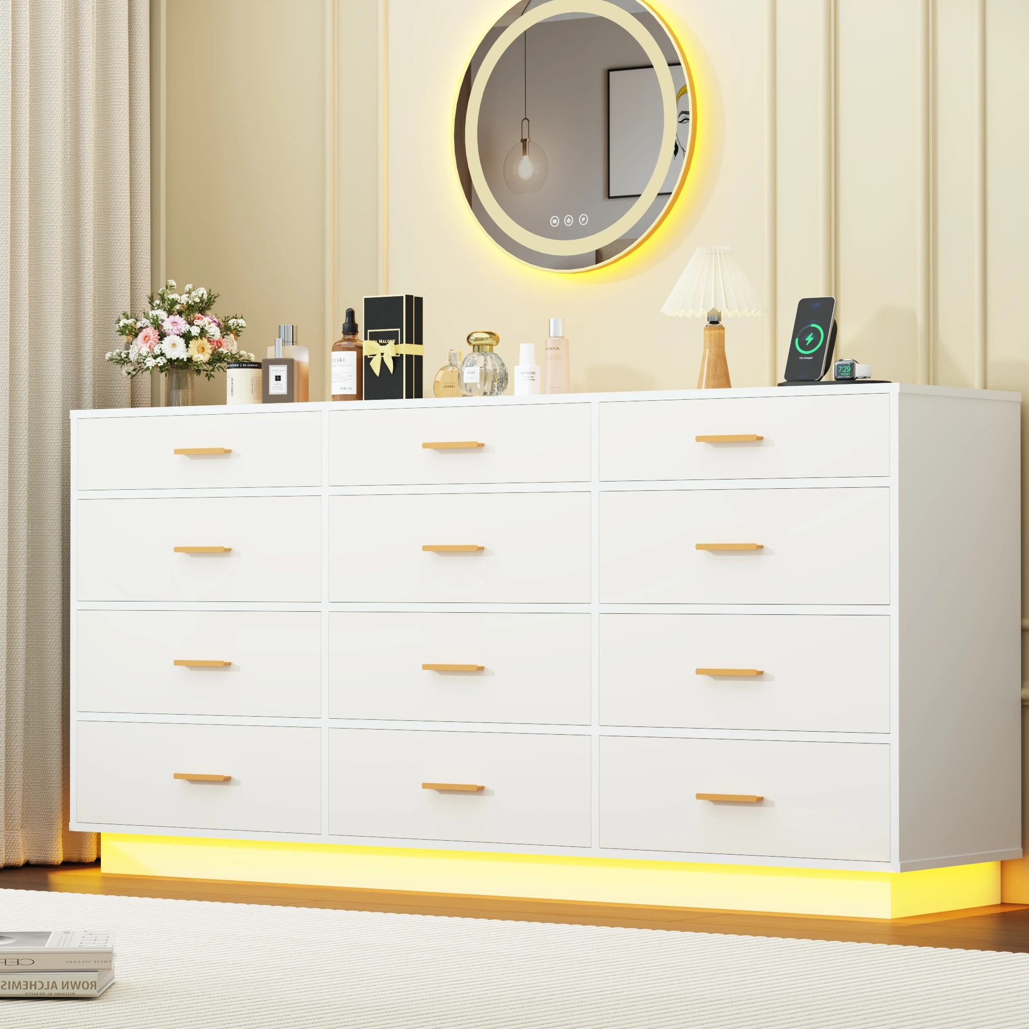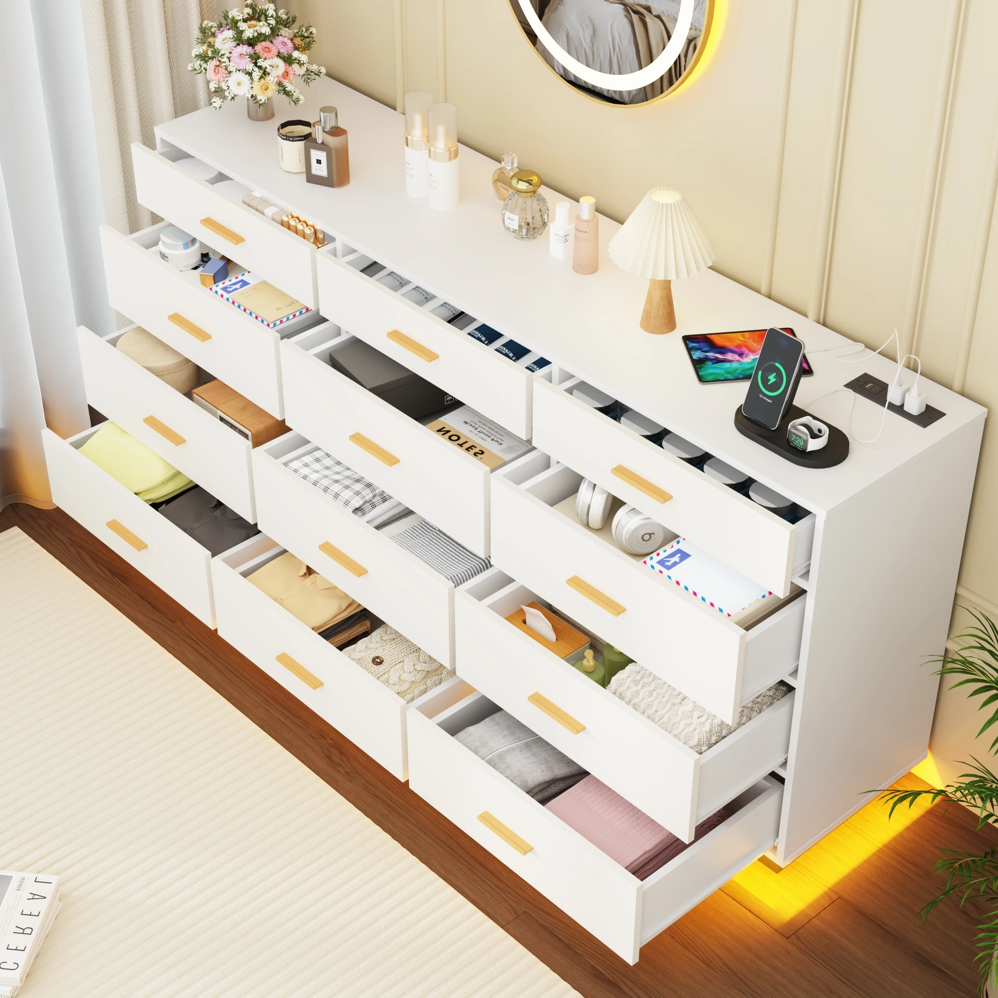 【Ample Storage】The dresser for bedroom has 12 large drawers, which is helpful for organizing clothing, books and toys. 4 drawers on each side for easy sorting. The drawer features back track, smooth sliding without noise. The spacious desktop allows you to display albums, vases and decorations.