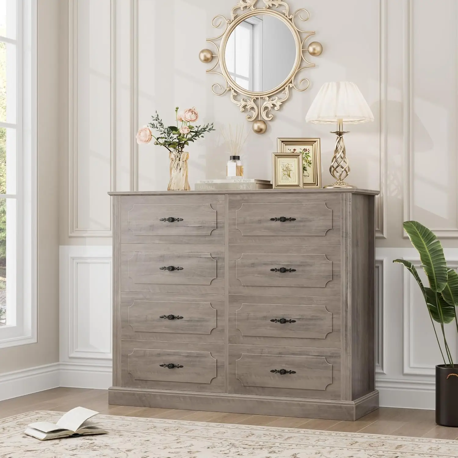 Grey Dresser Chest of Drawers, 47.2” Farmhouse Wood Dresser 8 with Steel Handles, Modern