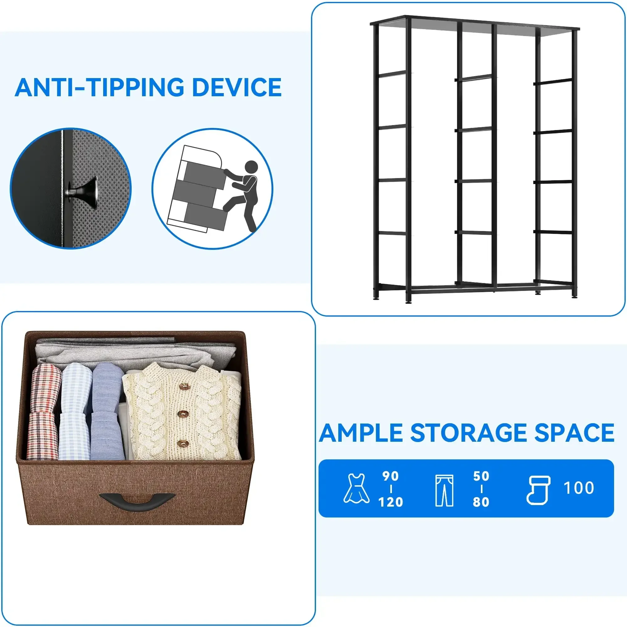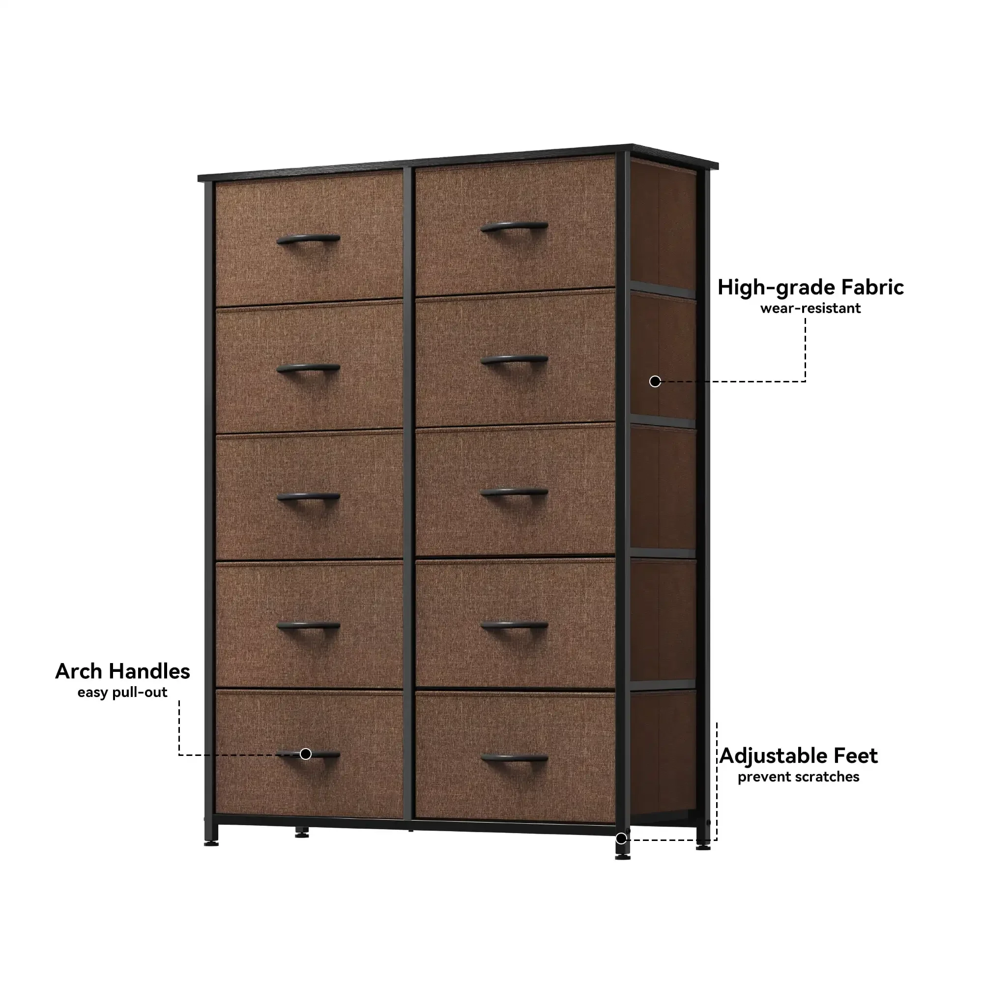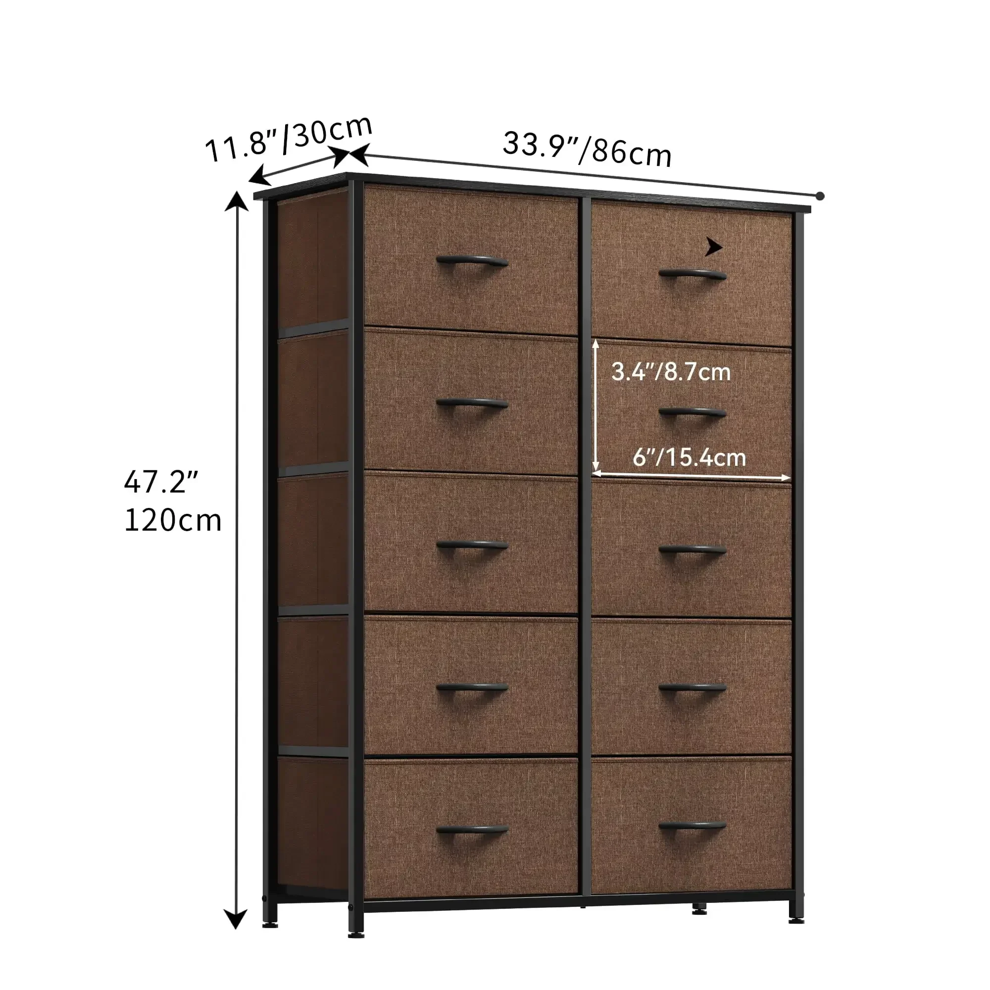 The 10-drawer fabric dresser combines efficient storage function with a modern simple appearance, which is super suitable for family use. The organizer separates and stores all of your wardrobe and linen essentials, and makes it easy to find and grab what you need right away. Ten removable drawers separate and organize clothing and accessories like hats, socks, shoes, scarves, blankets, and more in one convenient place. They offer roomy space for storing out-of-season clothing, shoes, purses, scarves, bedding, linens, and more. Besides, the MDF tabletop could be an eye-catching place to display the flower vase, family photos, and other adornments. The storage chest organizer is compact and lightweight, making it suitable for small spaces and transportation a breeze.