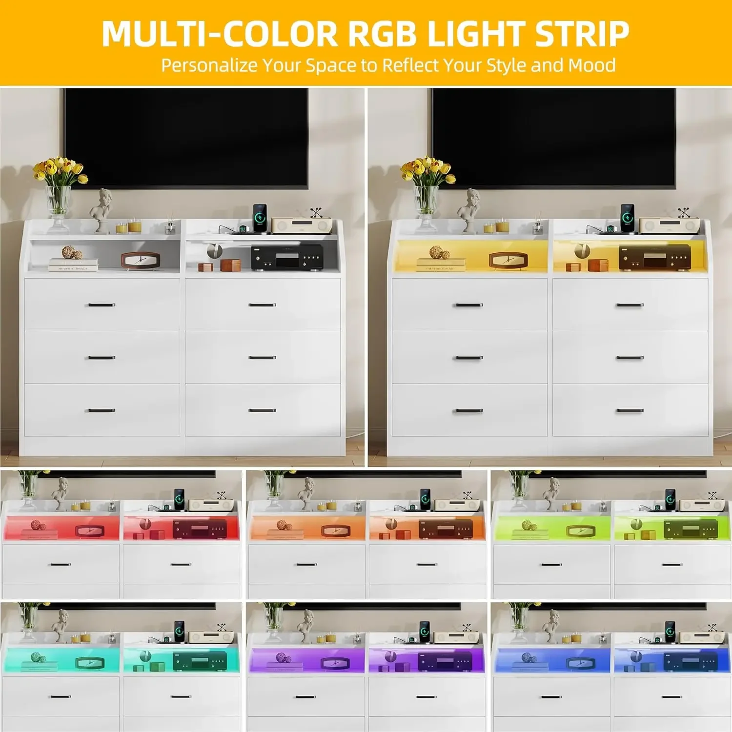 6 Drawer Dresser with LED Light and Charging Station, Modern Chest of Drawers, Wide Drawer Organizer Cabinet for Living Room