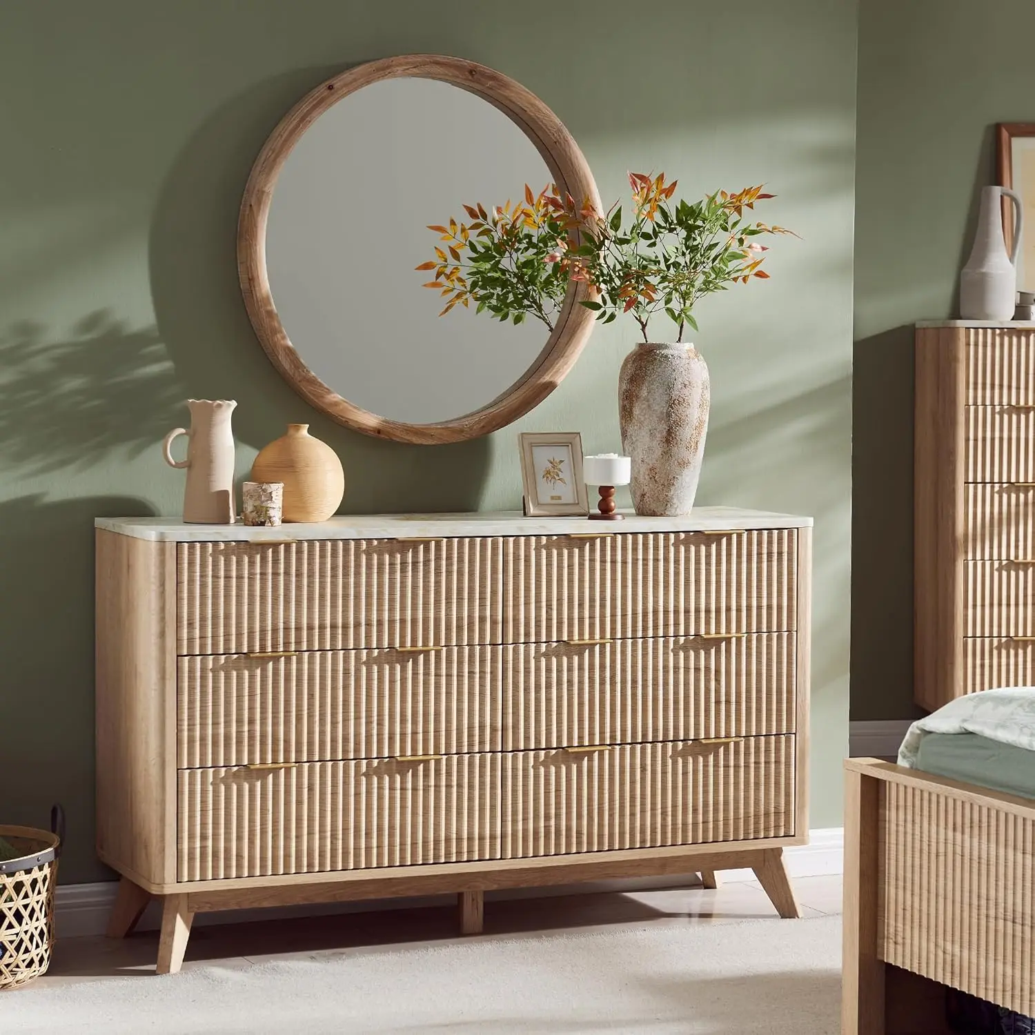 Fluted 6 Drawers Dresser, 54" Wide Modern Chest of Drawers with Faux Marble Top, Curved Profile Design, Dresser TV Stand, Wood Drawer Organizer for Bedroom, Living Room, Hallway, Natural Oak