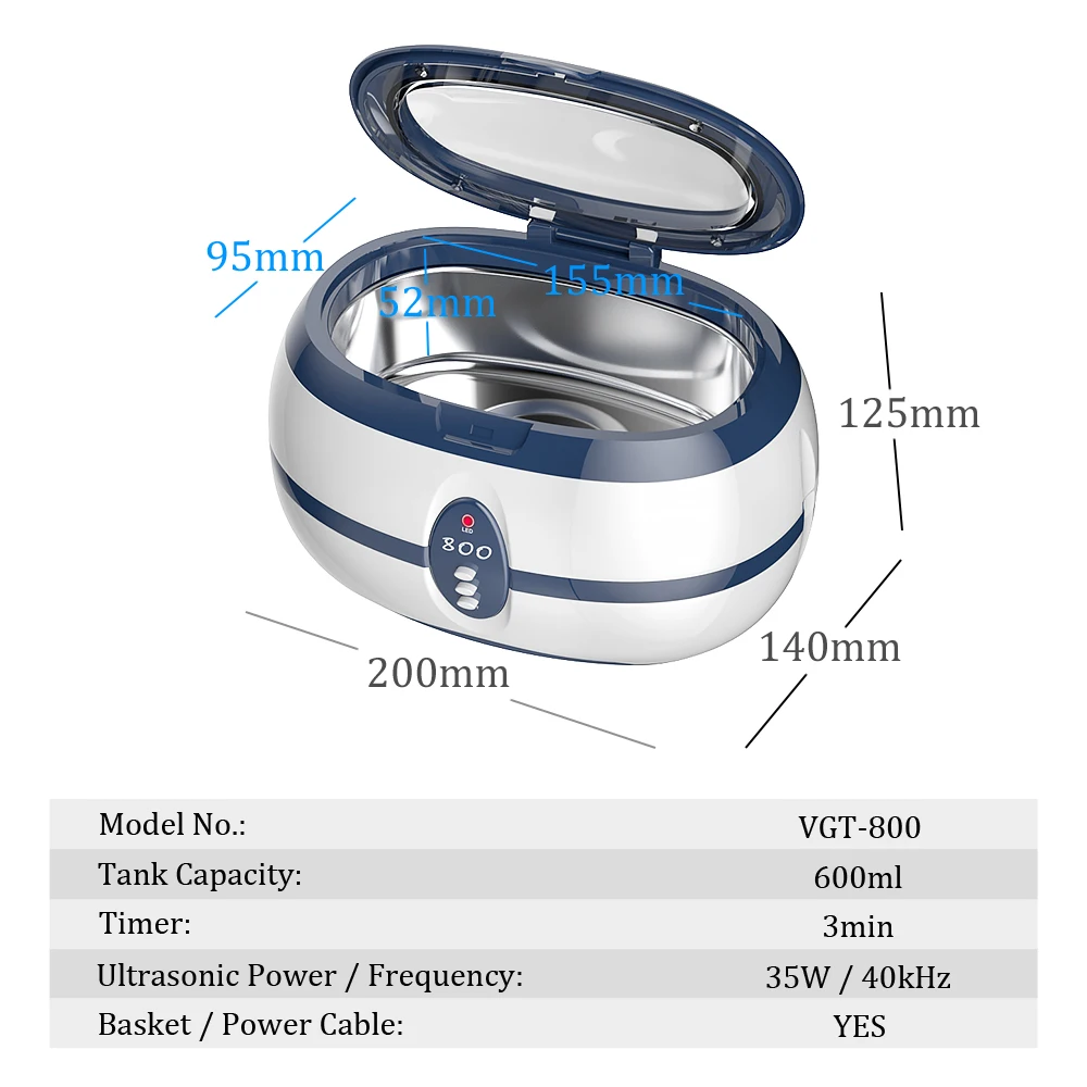Tank Capacity: 600ml (Since the bottom of the ultrasonic cleaner is a curved surface, the actual volume will be smaller.)