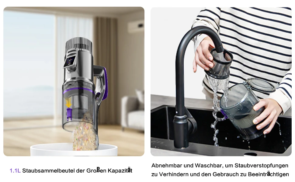 【Large Stepa & 5-stage filtration 】:This cordless vacuum cleaner features multi-cone cyclonic filtration and an extra-large Stepa filter system with 5 layers that saves 99.98% of fine dust, bacteria and dust mites for better filtration. Ideal for allergy sufferers and pet holders. The filters are ashable and reusable.