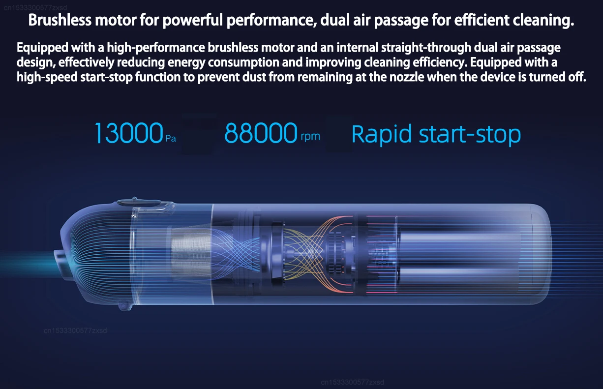 Equipped with a high-performance brushless motor and an internal straight-through dual air passage design, effectively reducing energy consumption and improving cleaning efficiency. Equipped with a high-speed start-stop function to prevent dust from remaining at the nozzle when the device is turned off.
