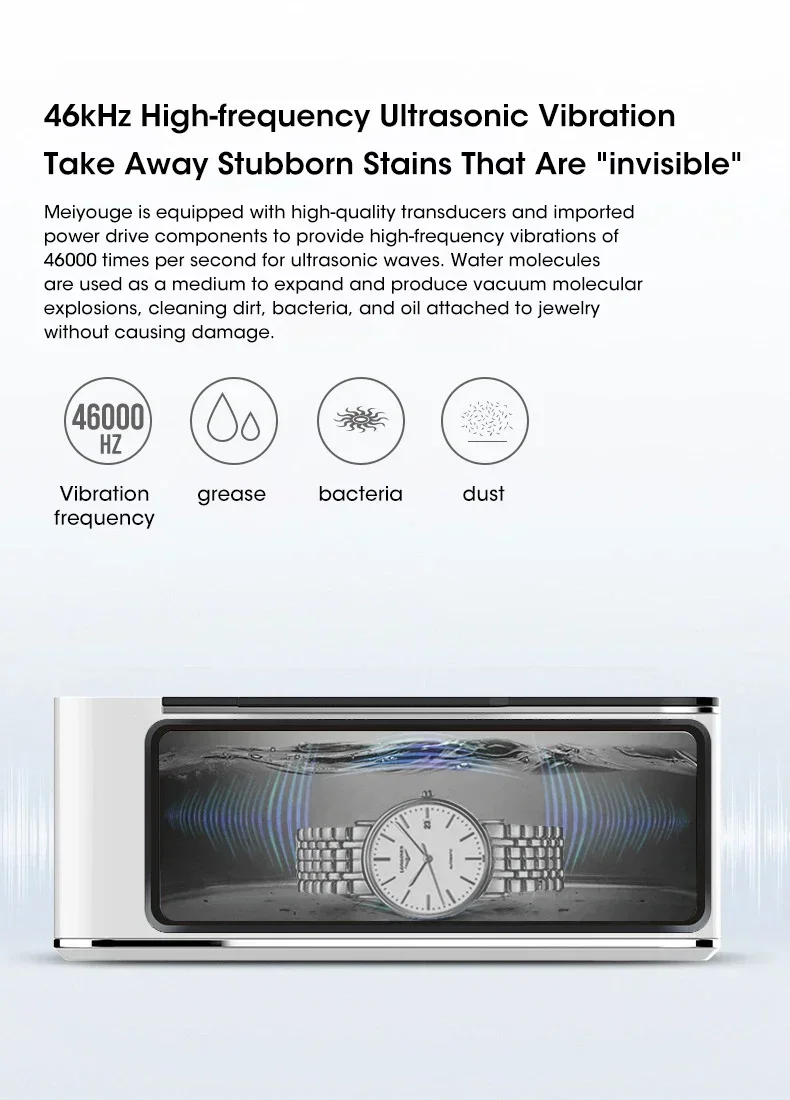 1.Comprehensive application: This ultrasonic cleaner offers unmatched versatility. Its application covers cleaning of gold, platinum, diamonds, rings, watches, glasses, sunglasses, toothbrushes, dents, southern guards, makeup brushes, coats, pens, contact lenses, pacifiers and much more.