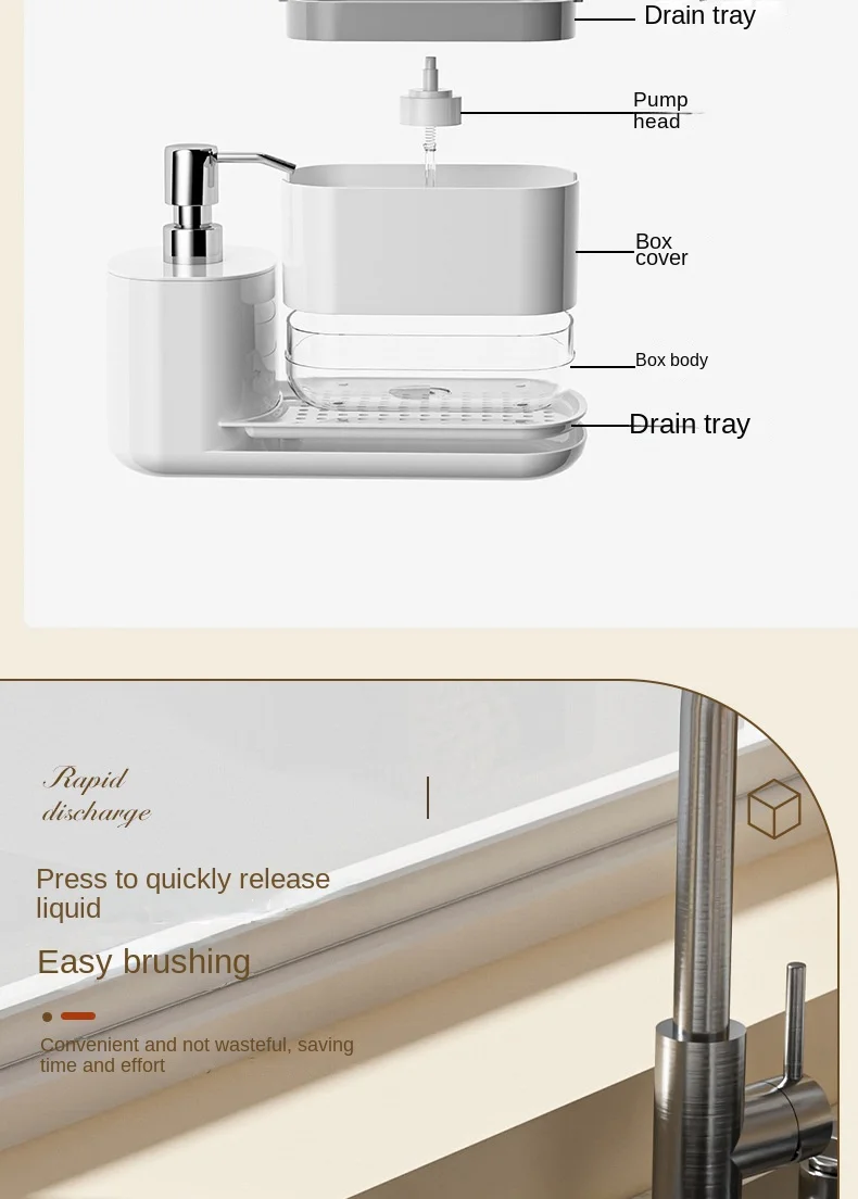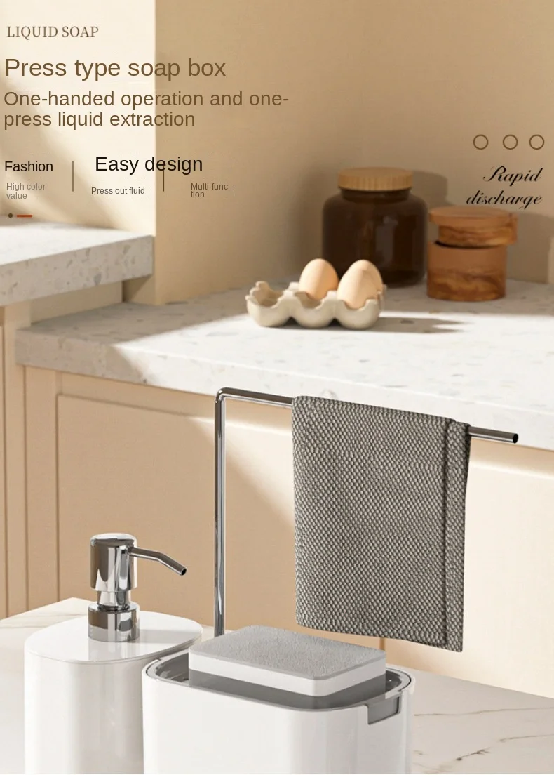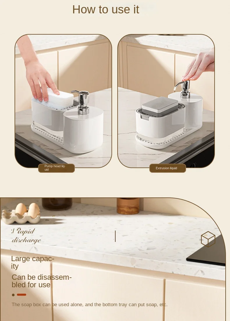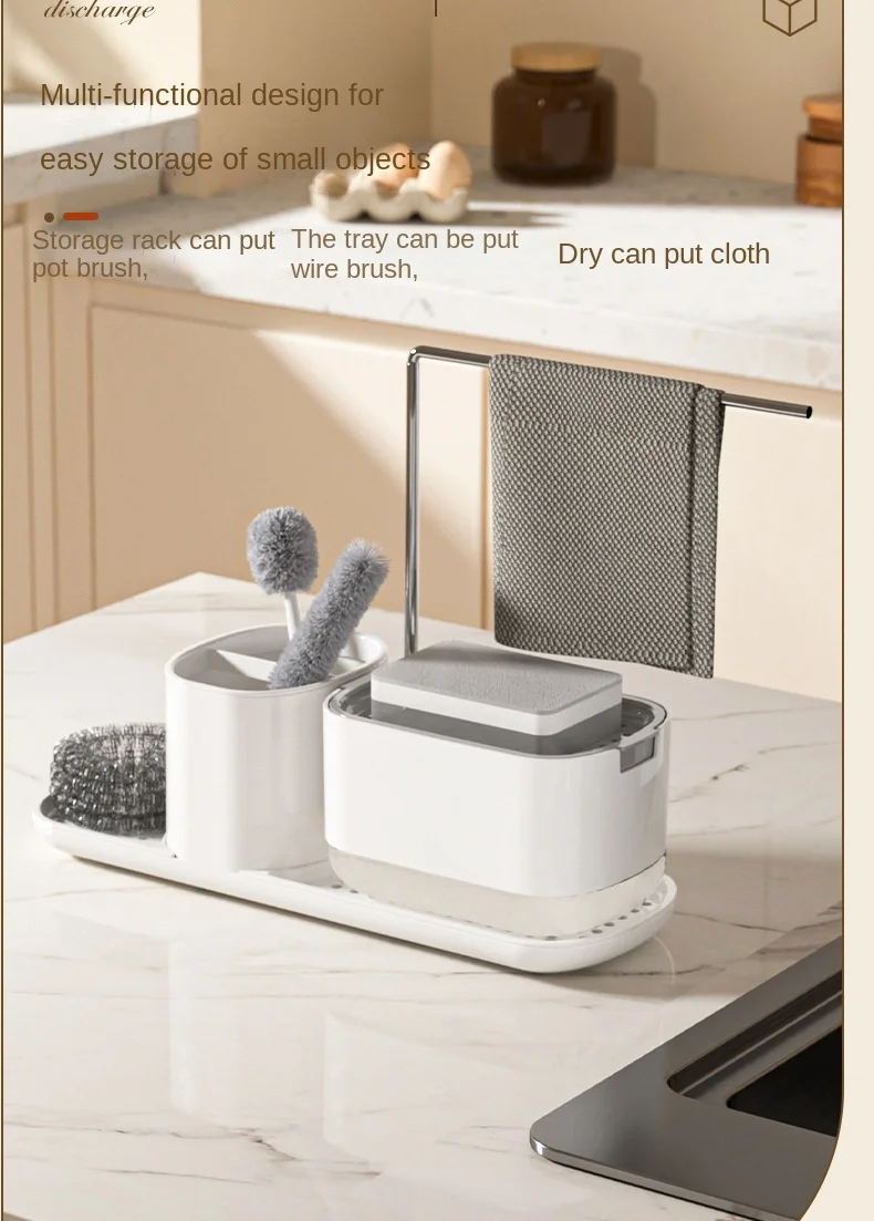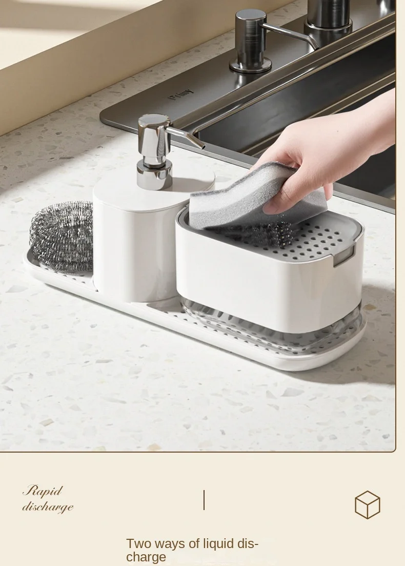 Kitchen countertop, detergent outlet box, sink, hand sanitizer outlet box, press soap dispenser, kitchen storage rack