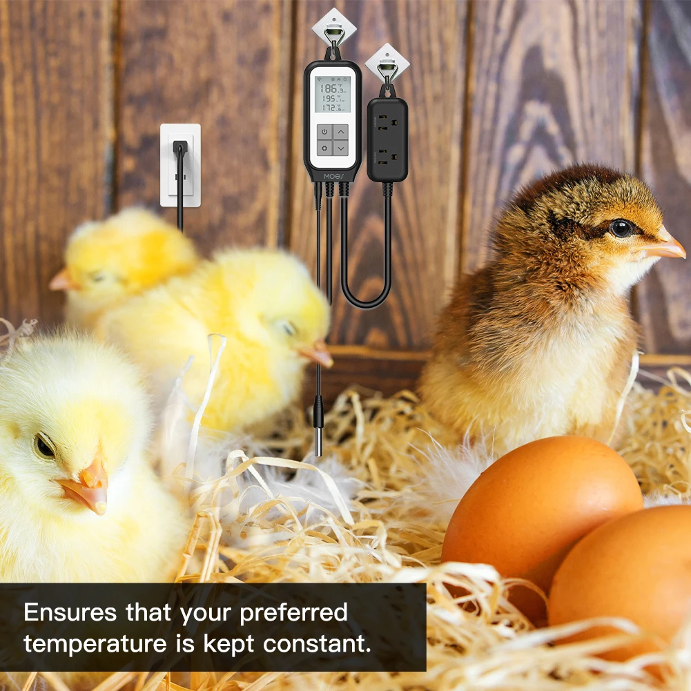 1.Simple Setup: MoesWiFi digital temperature controller comes with smart heating and cooling outlets; Simply plug in the smart thermostat, you can mount or hang the plug to your own need; it allows to place it to the wall stably or glass with the suction cup on the probe;Easily complete your installations in minutes.