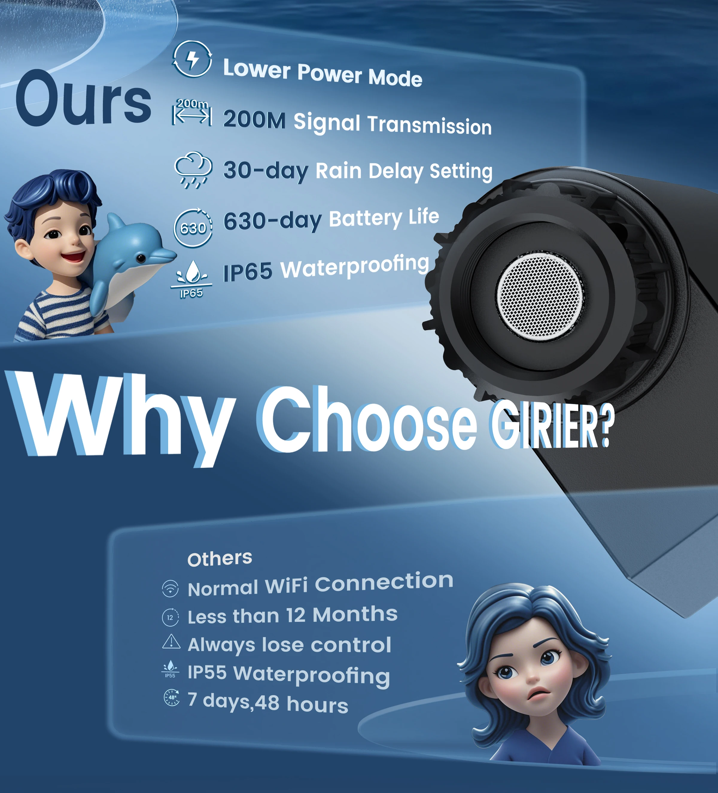 GIRIER's water timer boasts a lower power consumption mode, eliminating the need for additional hubs or repeaters. This ensures a stable and powerful Wi-Fi connection, allowing you to enjoy seamless control over your irrigation system. With GIRIER, you can confidently water your garden knowing that your system is both responsive and reliable.