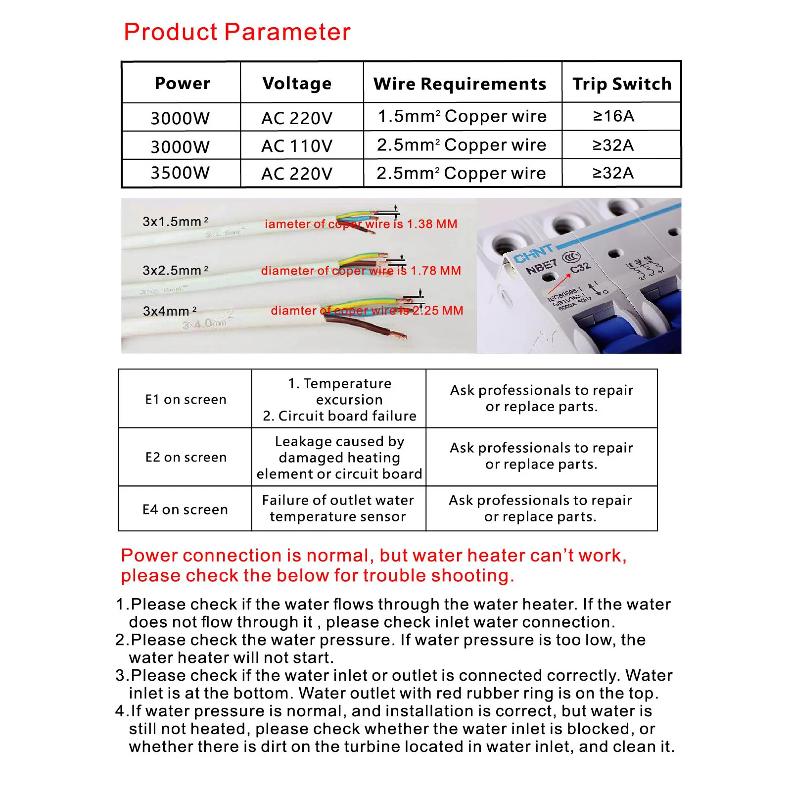 Installation Wire Diameter: 2.5m² copper wire (US), 1.5m² copper wire (EU & UK & AU)