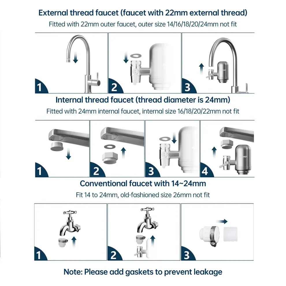 EASY TO INSTALL: With product video and instructions you can easily install the faucet water filter by yourself, no tools required. The filter fits with most faucets but not for pull-out or hand-held faucets. *Package includes 1 filter, 3 adapters (M24 internal thread & seal fitting 0.94", M22 external thread & seal fitting 0.87", M24 external thread fitting 0.94"), 1 universal joint, and 1 activated carbon block filter.