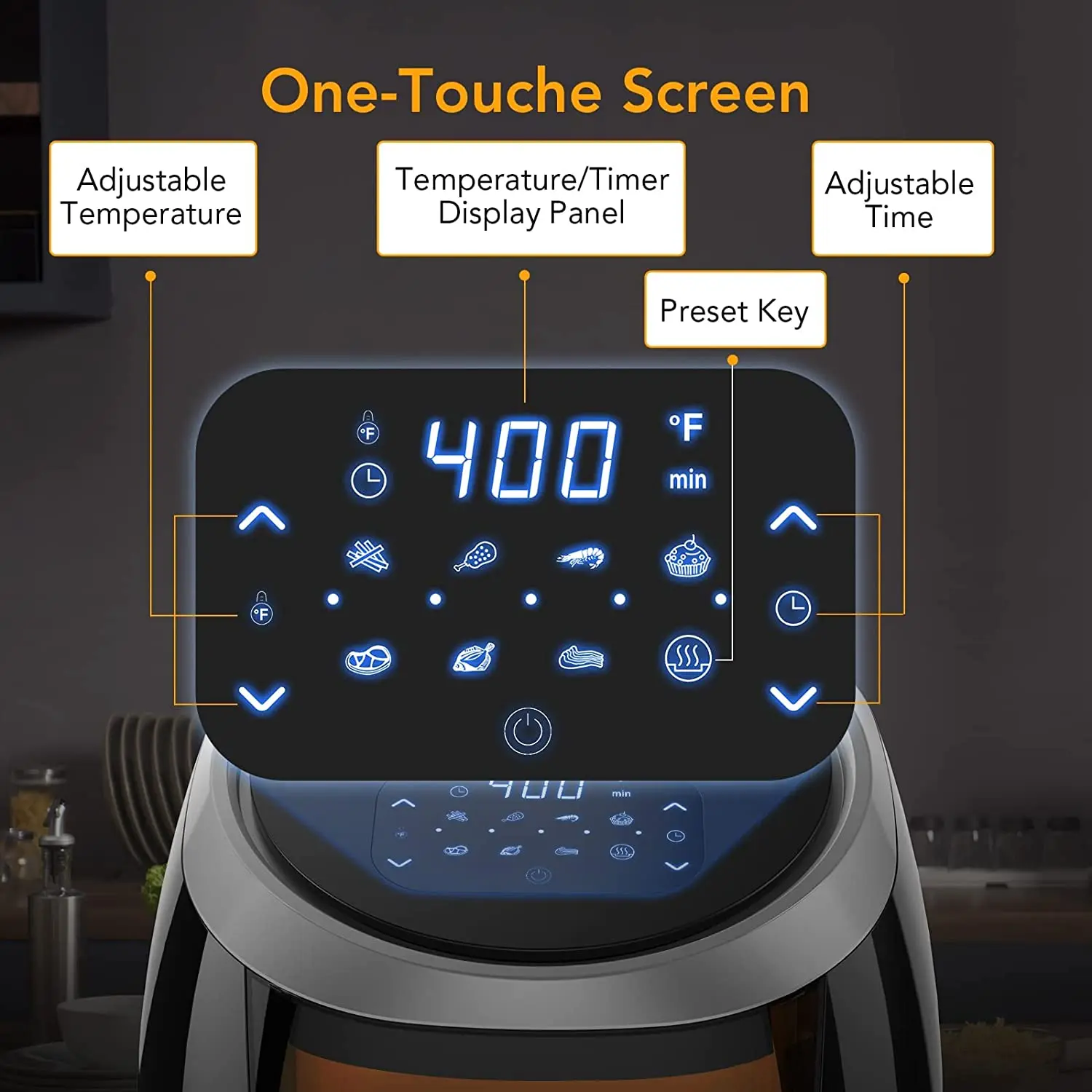 🌭Visible Window: This air fryer has a clear window that allows you to see what your dinner is cooking without lifting the air fryer lid, without pulling out the air fryer basket. Upgraded smart touch screen with large digital LED panel.