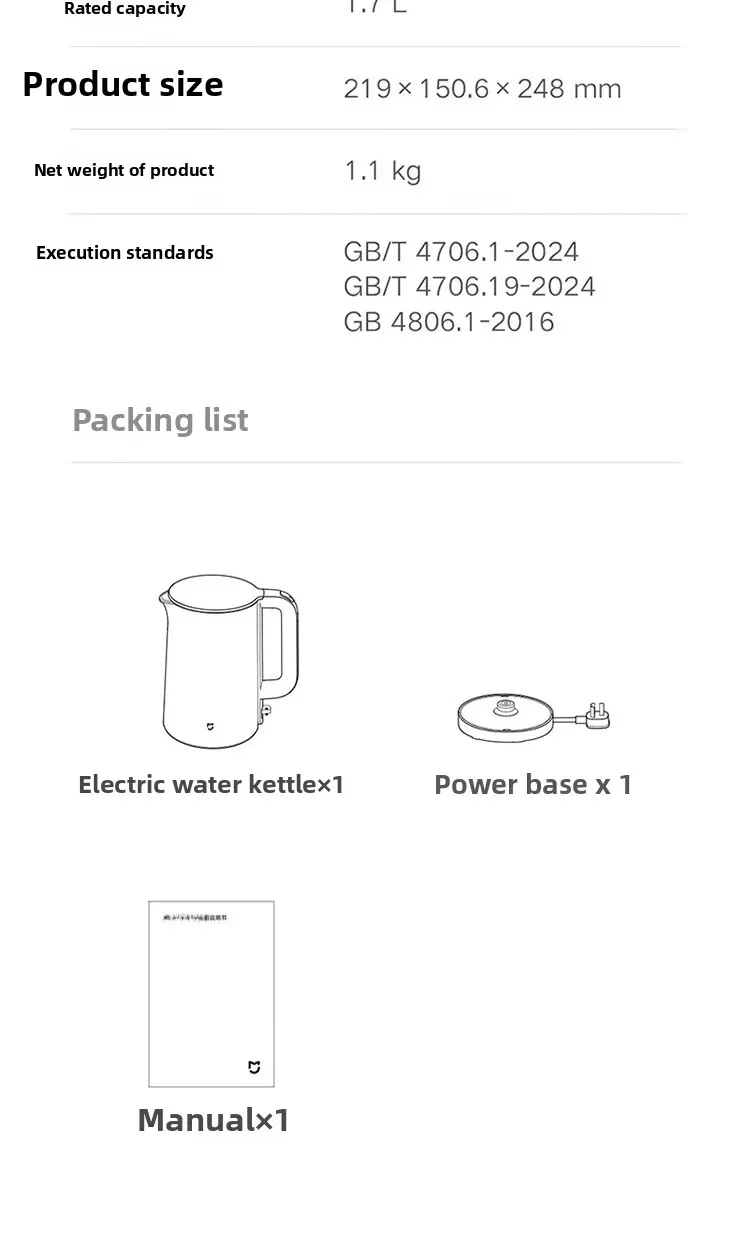 Mijia electric kettle*1, power base*1, instruction manual*1