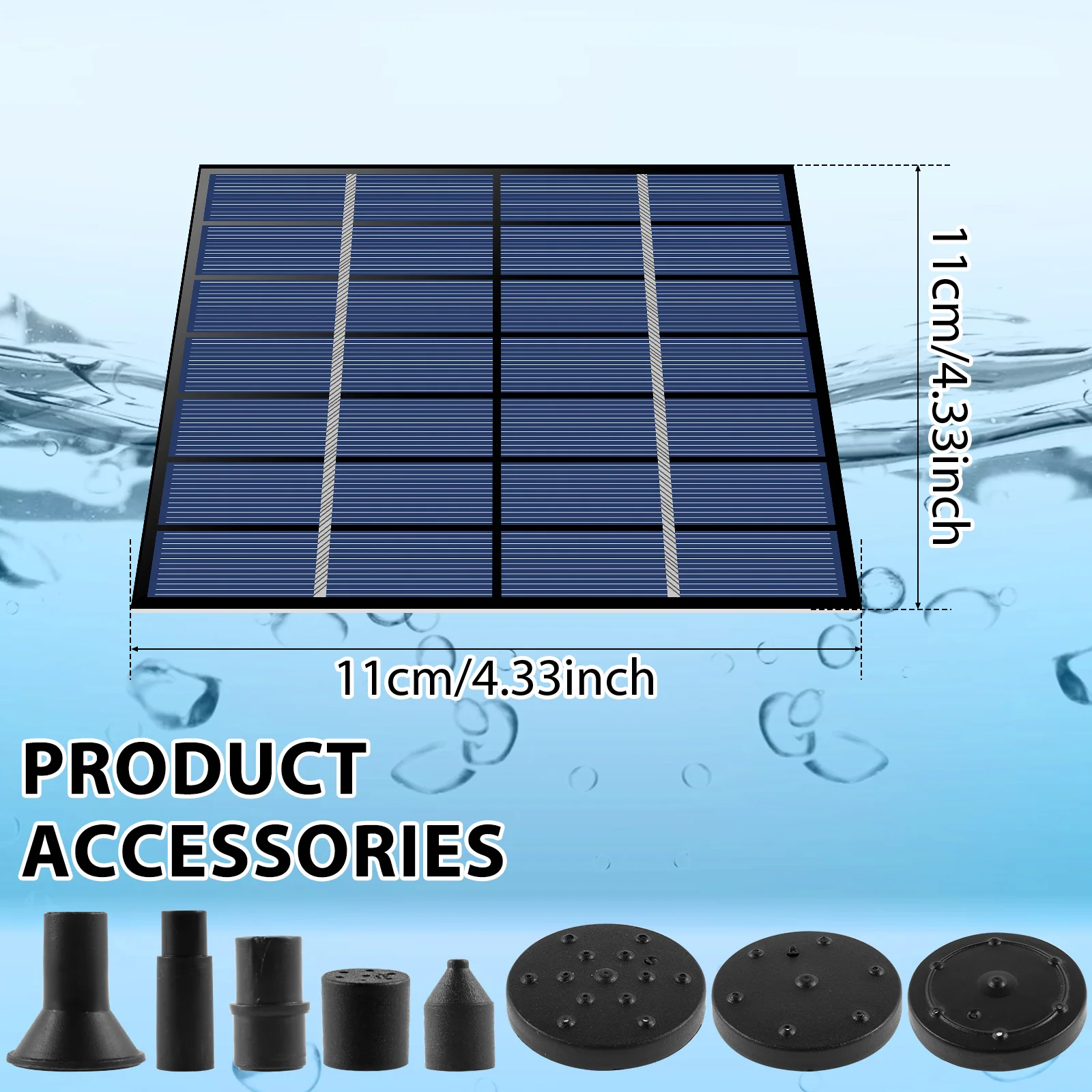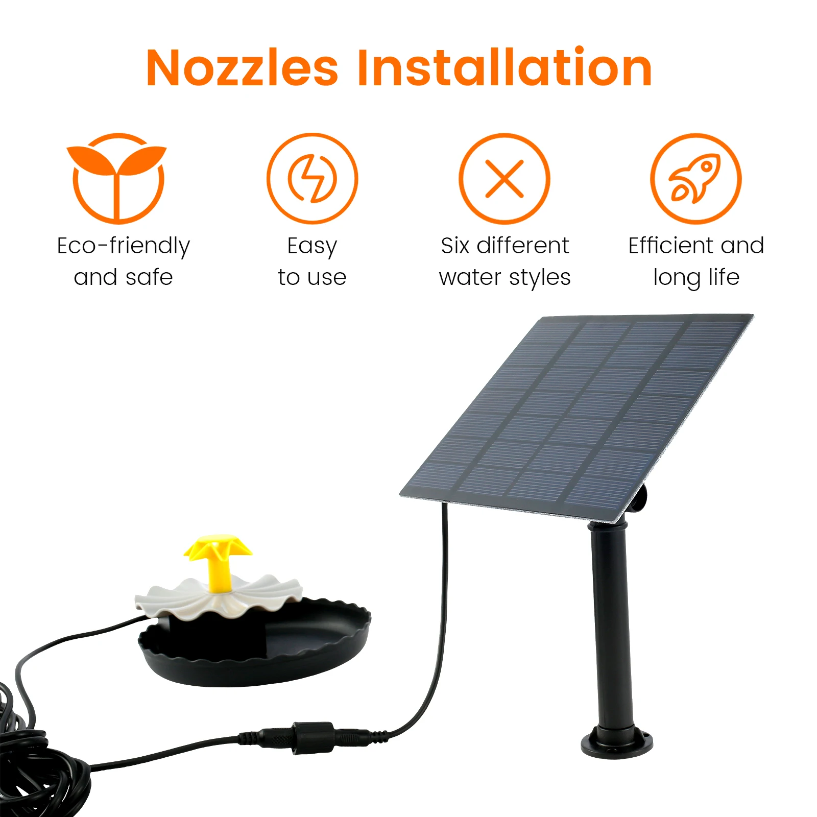 [6 Different Water Styles] This solar fountain comes with 6 different nozzles, you can easily change the nozzle shape to prevent water from splashing around. It can be attached to a hose to create different water features to suit your good ideas. This is a multifunctional solar water pump, perfect for bird baths, fish tanks, small ponds, and gardens.
