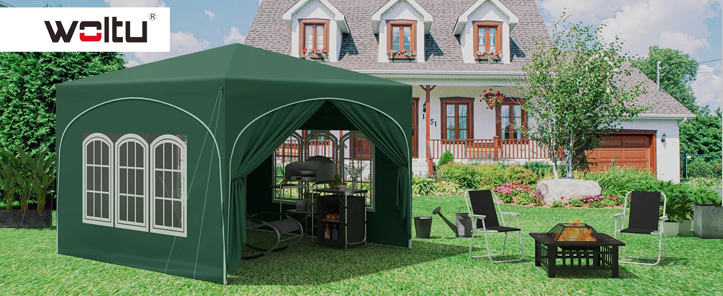 • 🌞SOLID STRUCTURE: The WOLTU folding gazebo frame is made of metal with powder coating to be rust resistant and durable. The 8 ground stakes and the 4 ropes of 2.8m reinforce the stability and the safety of use