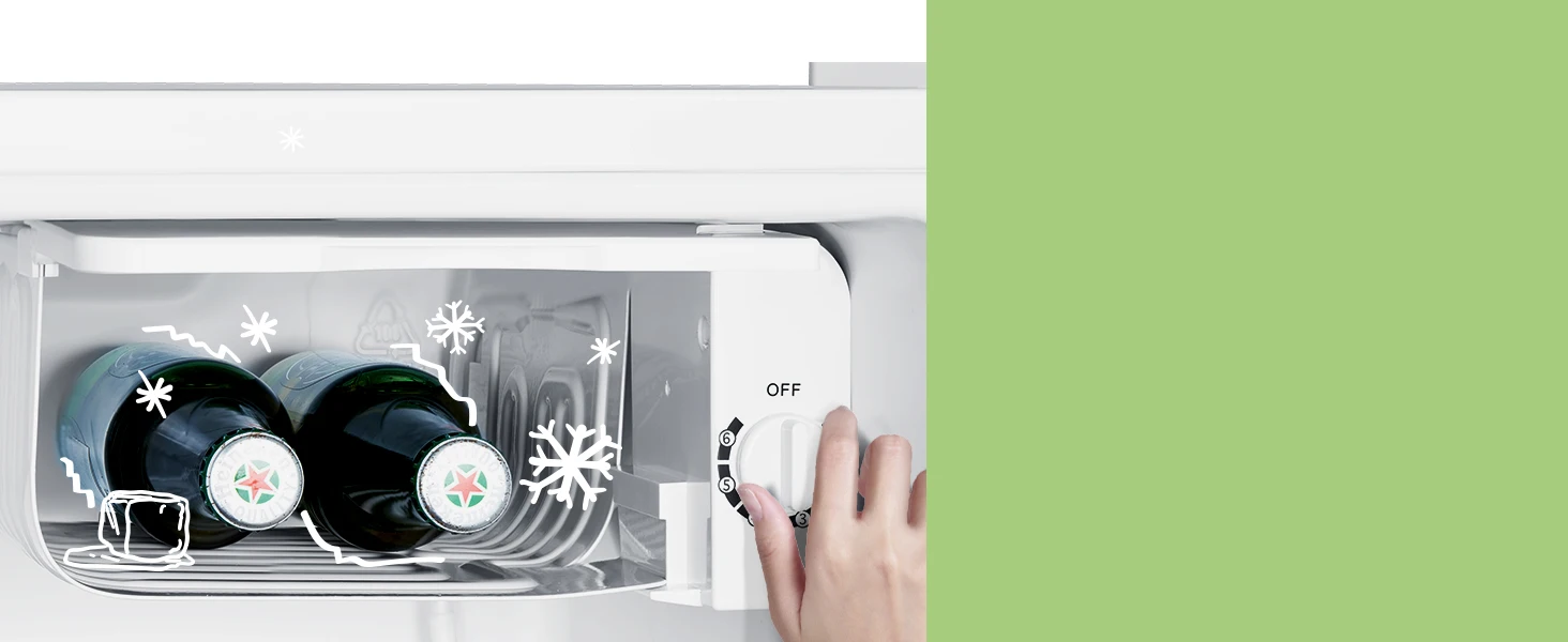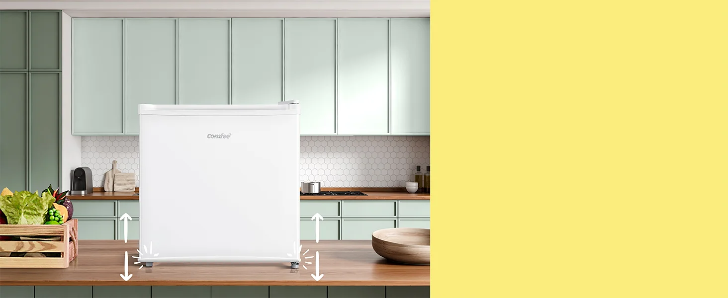 Adjustable thermostat and feet-Adjustable mechanical thermostat allows you to keep your food at a temperature between 1 °C and 10 °C. The refrigerator is also equipped with two adjustable legs at the front for horizontal level.