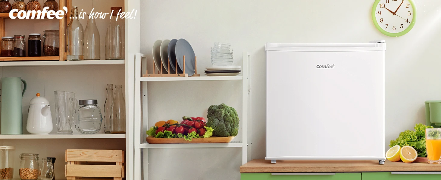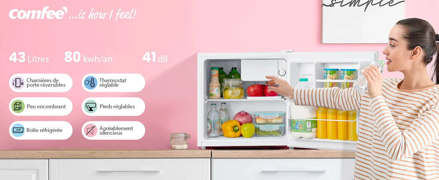 Energy Savings & E-Class Budget-This small fridge is environmentally friendly and works with low power consumption and low sound level (41 dB).