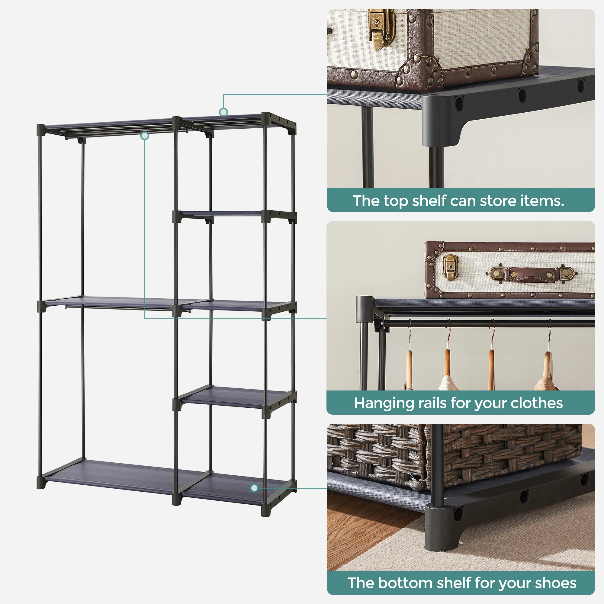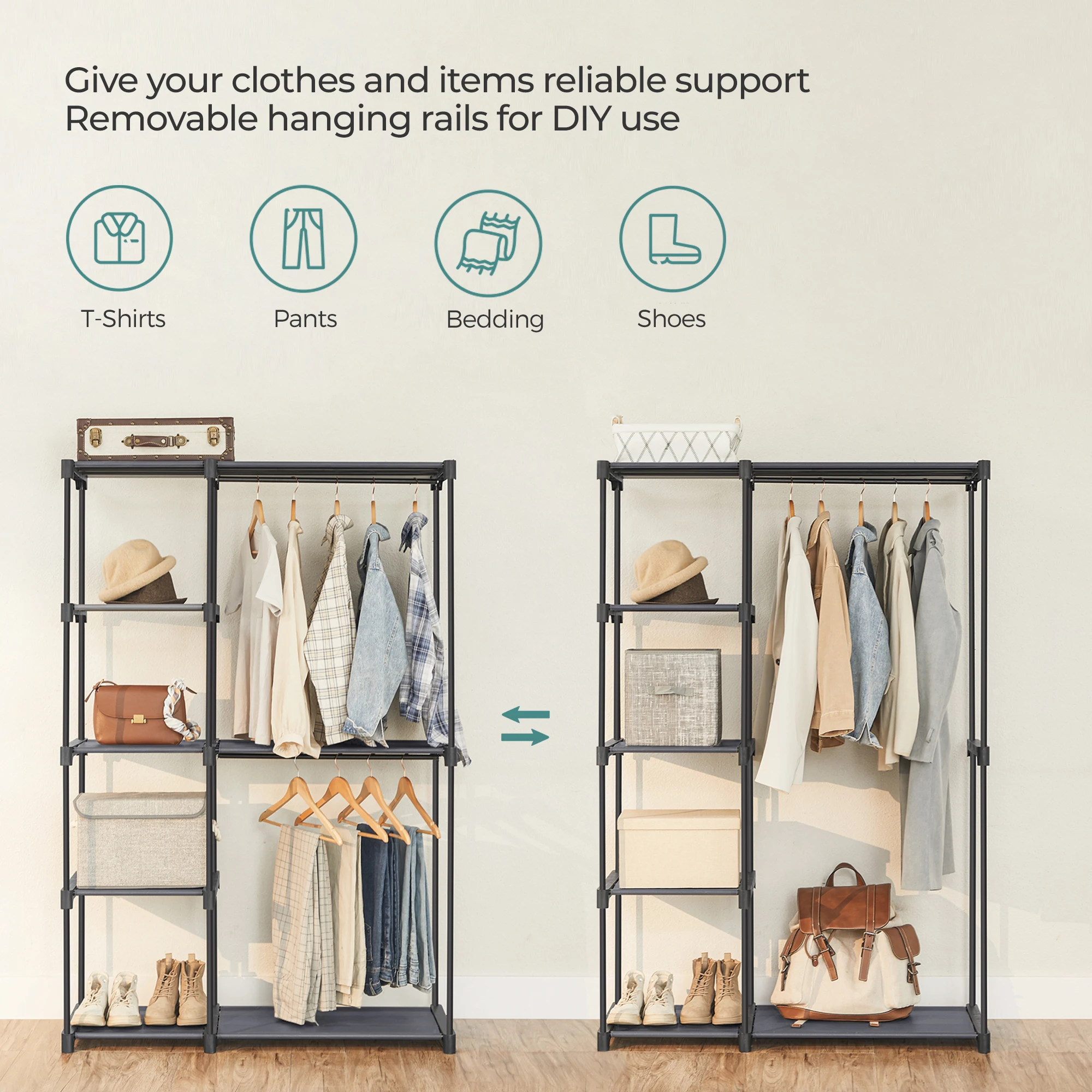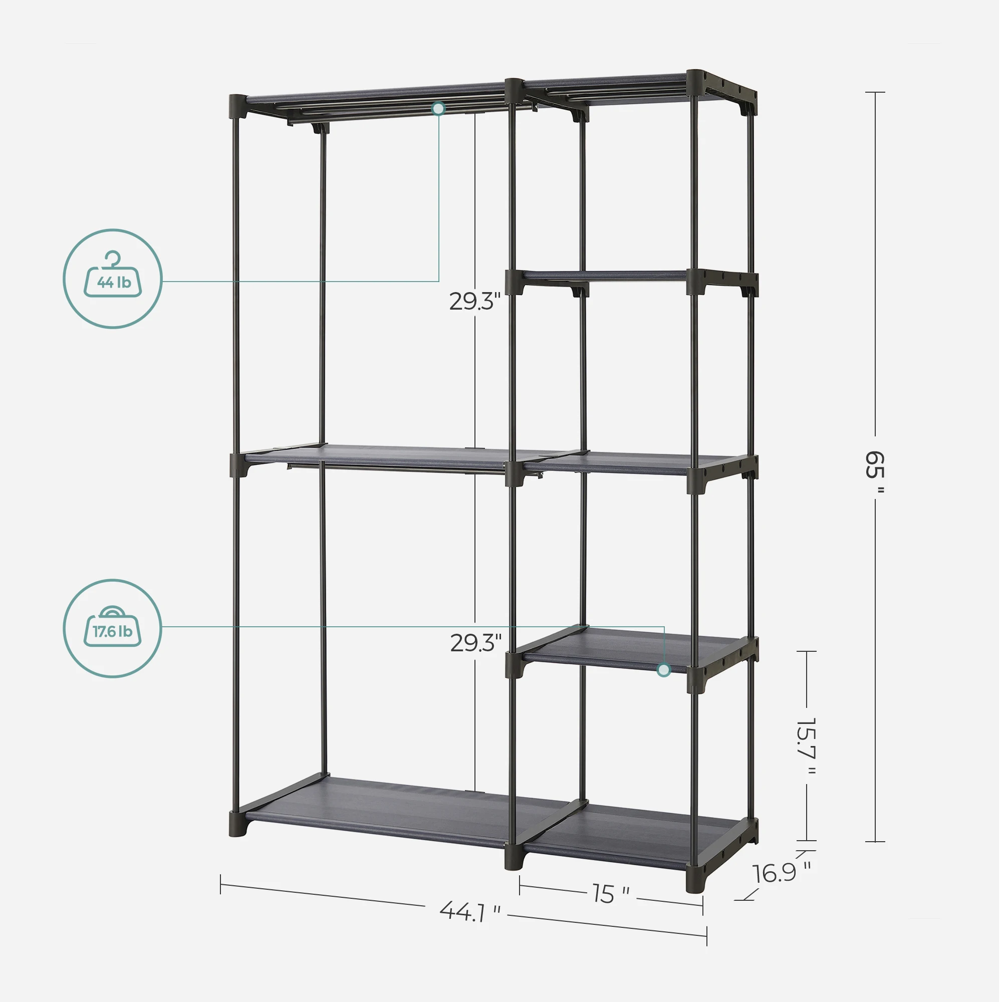 [Ample Storage Space] Sized at 44.1"L x 16.9"W x 65"H, this closet rack offers you 2 spacious storage areas for hanging up clothes, plus multiple shelves for folded clothing. You can also remove the middle shelf to hang longer garments