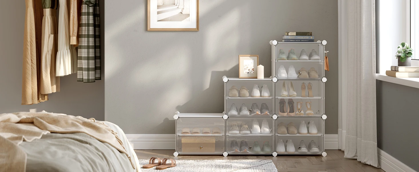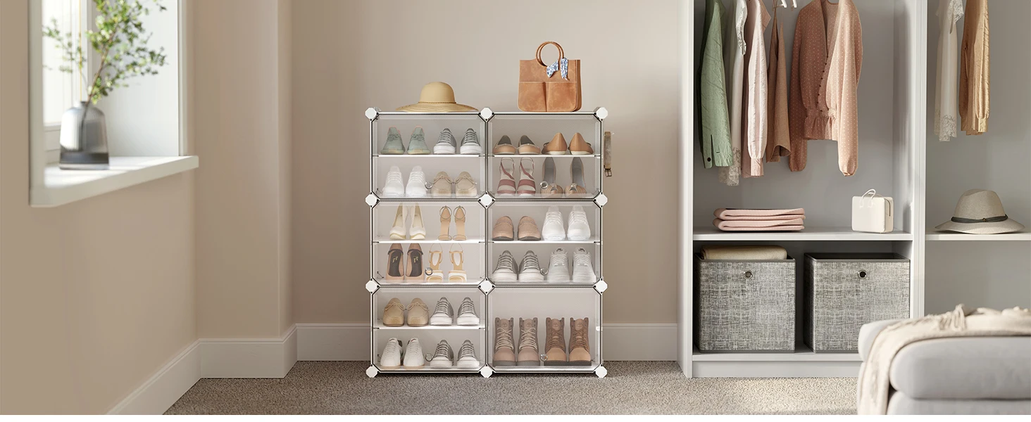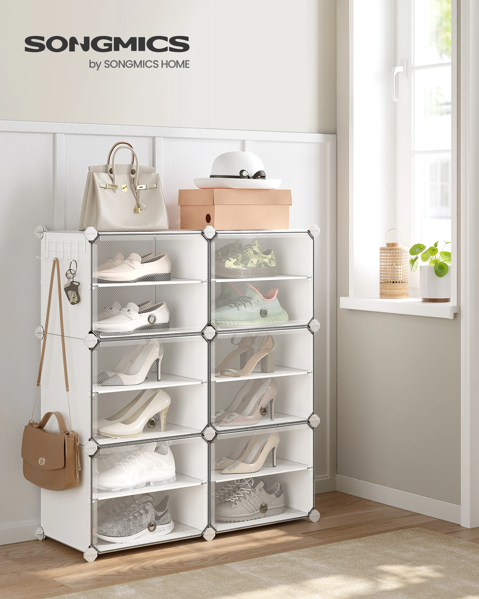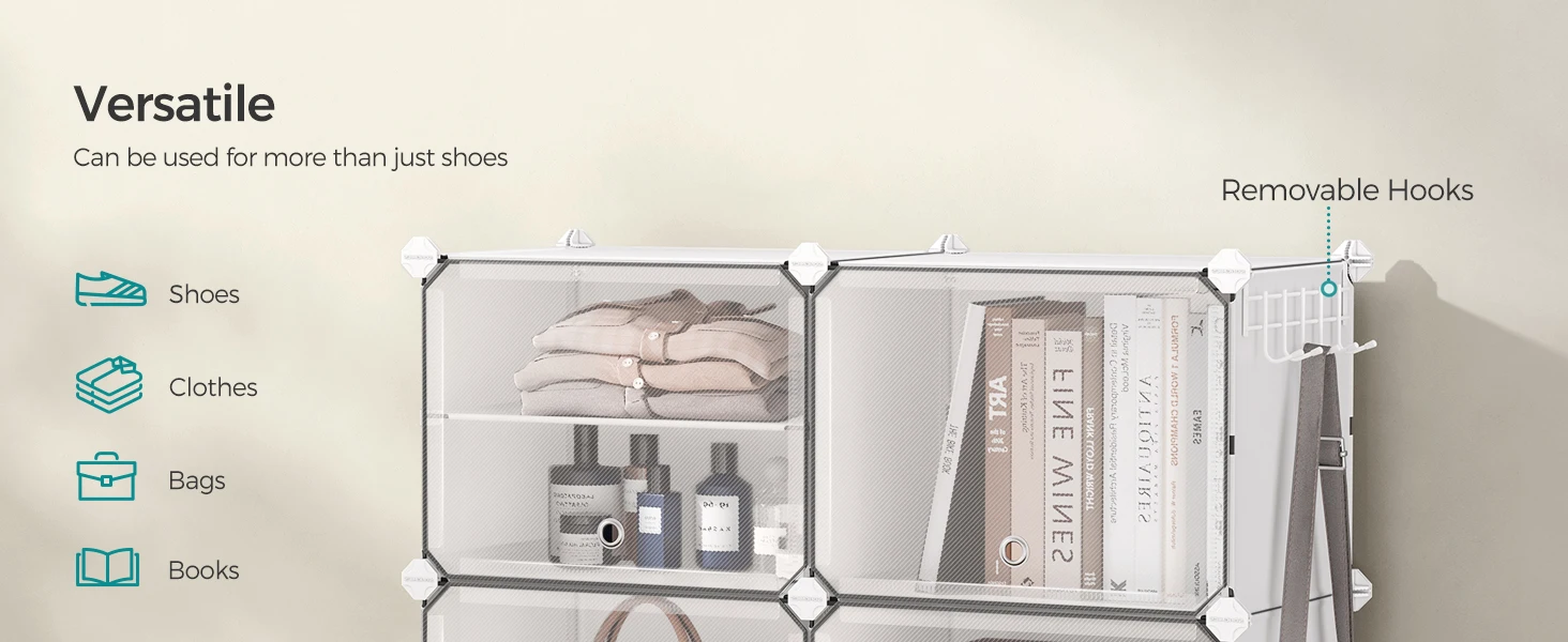 • [Storage Aplenty] This versatile plastic shoe storage organizer, able to accommodate up to 24 pairs of shoes, doubles as storage for bags and clothing. Its space-efficient side hooks offer a handy spot to hang hats or dog leashes