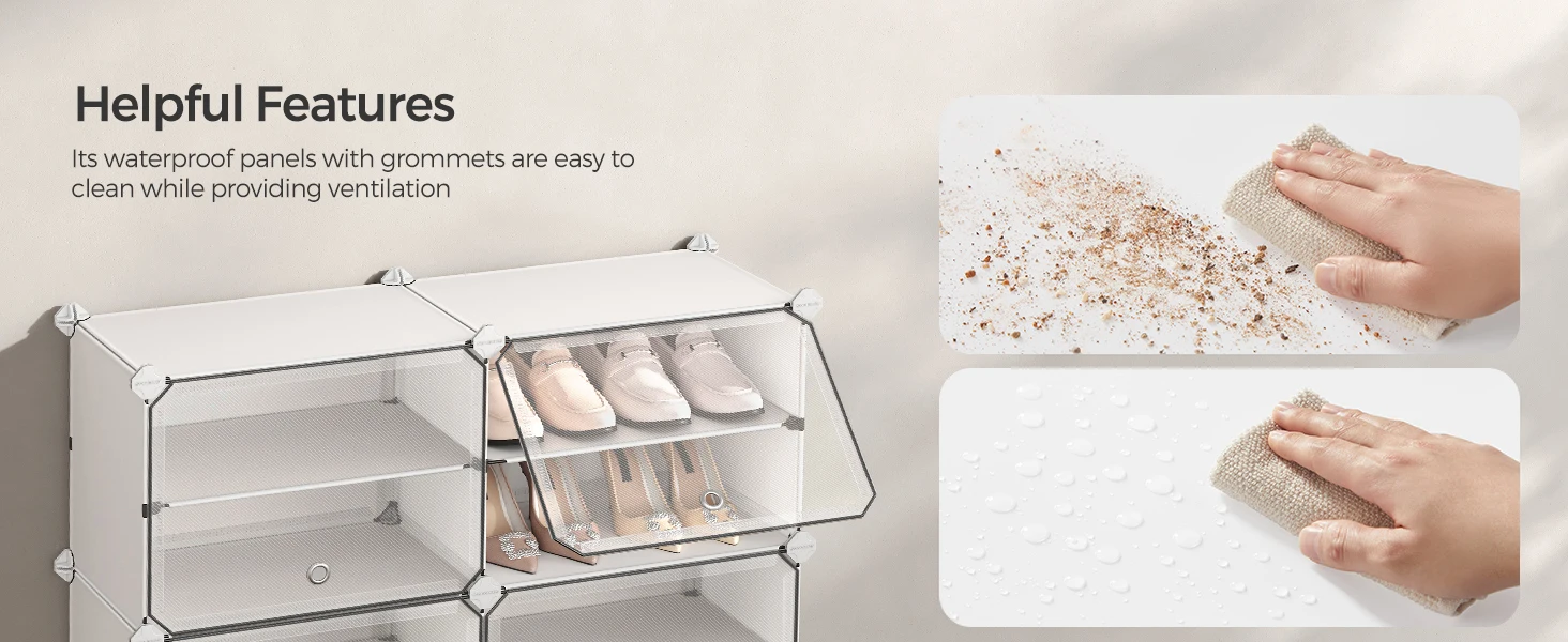 • [Ventilated and Easy to Clean] This plastic shoe cabinet features clear doors, providing dust-proof and waterproof protection while allowing easy viewing of shoes inside. Grommets on the doors enable effortless opening and promote ventilation