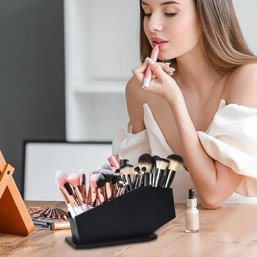 This makeup brush holder is made of sturdy wood with a coffin-like appearance, neatly organizing your brushes & accessories. Holds a variety of items & is a perfect present.