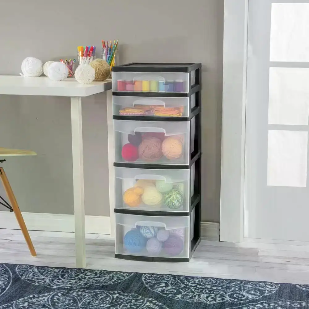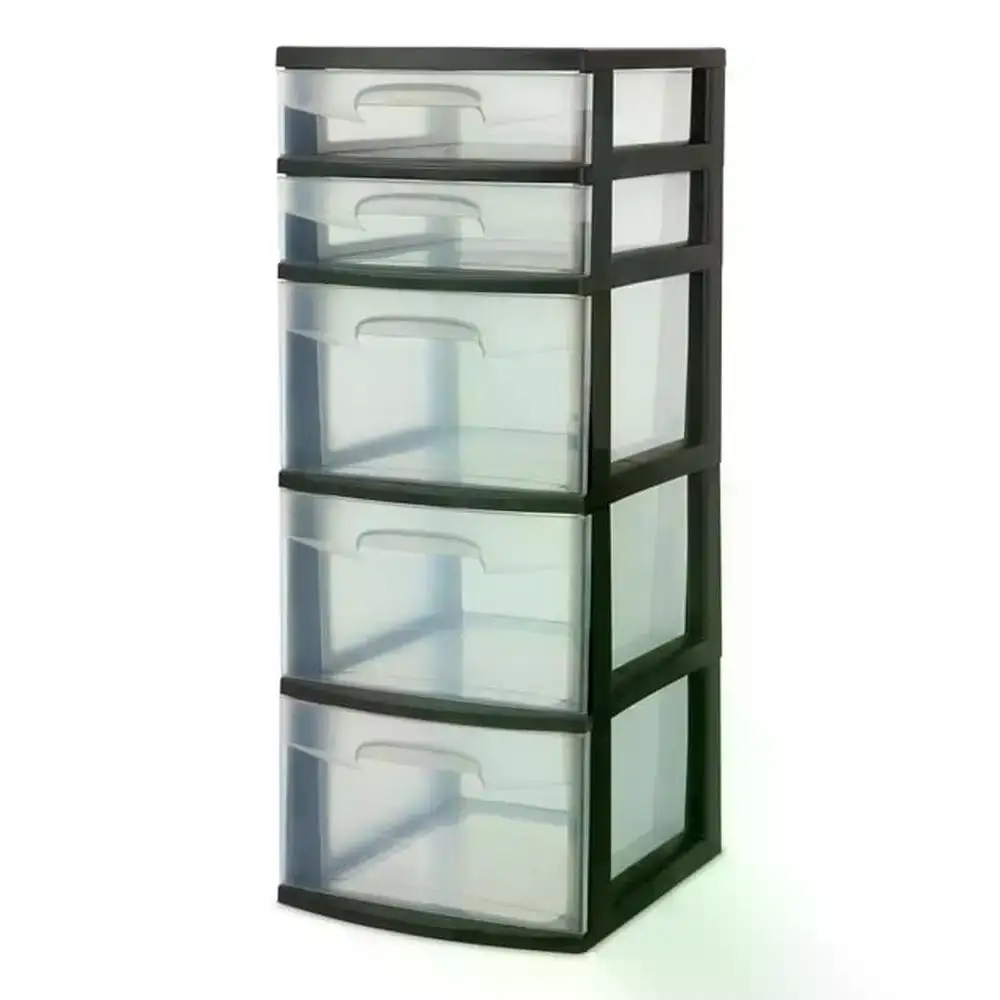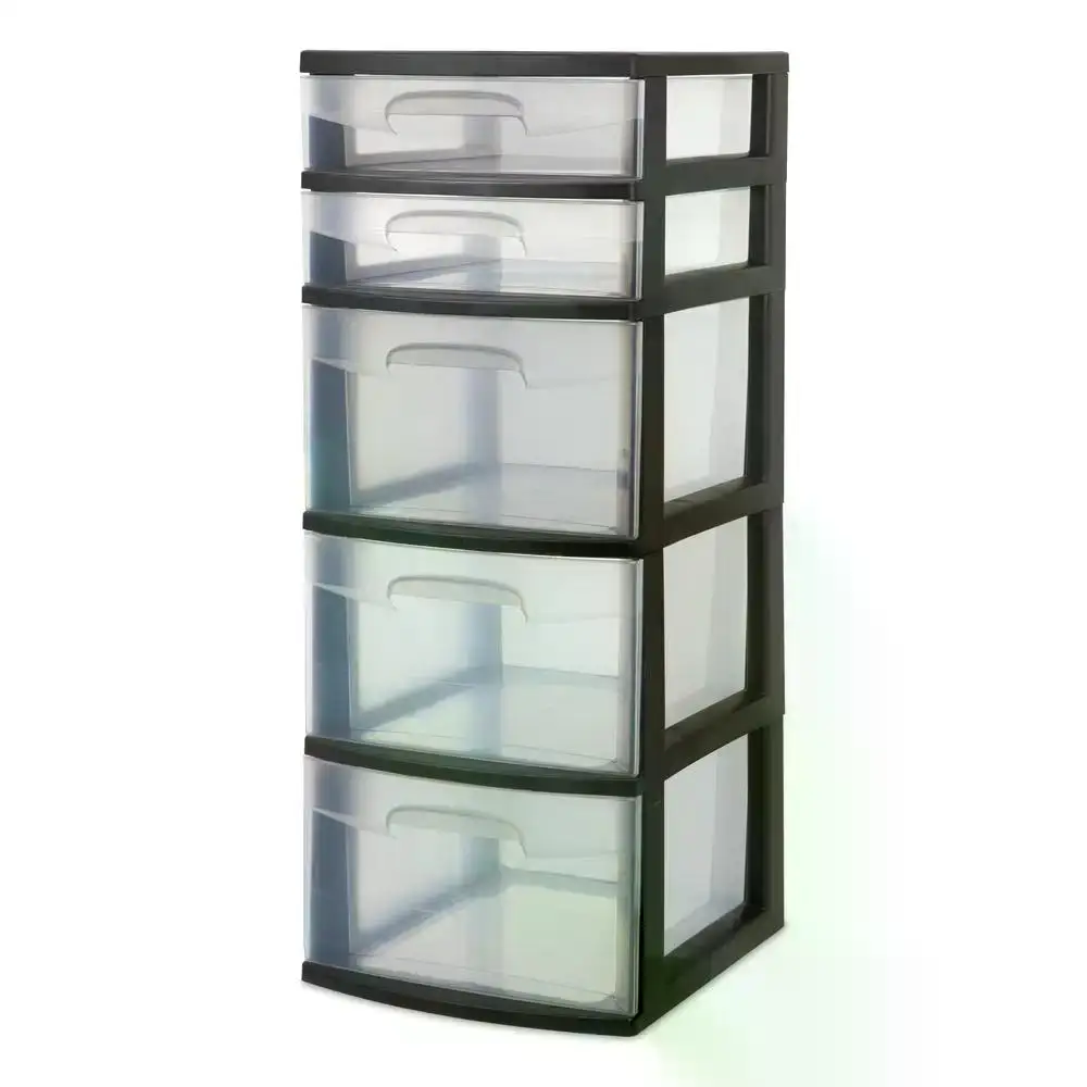 This Sterilite 5-Drawer Tower helps to keep your busy life in order. It helps upgrade your storage options, and has a modern style that blends in with most decor. This black drawer tower features clear compartments that are helpful for holding multiple items. Plus, it gives you a simple way to organize a cluttered bathroom and is suitable for makeup, towels, hair accessories and so much more. This Sterilite tower also makes a handy addition to children's playrooms. Keep their toys, games and art supplies stacked neatly in one place. The modern design helps it to be stored in the open to maximize space, while the clear material makes it easy to see the contents inside. It also comes in handy for arranging craft supplies and sewing items, or for keeping office supplies such as paper and stationery neatly tucked away.