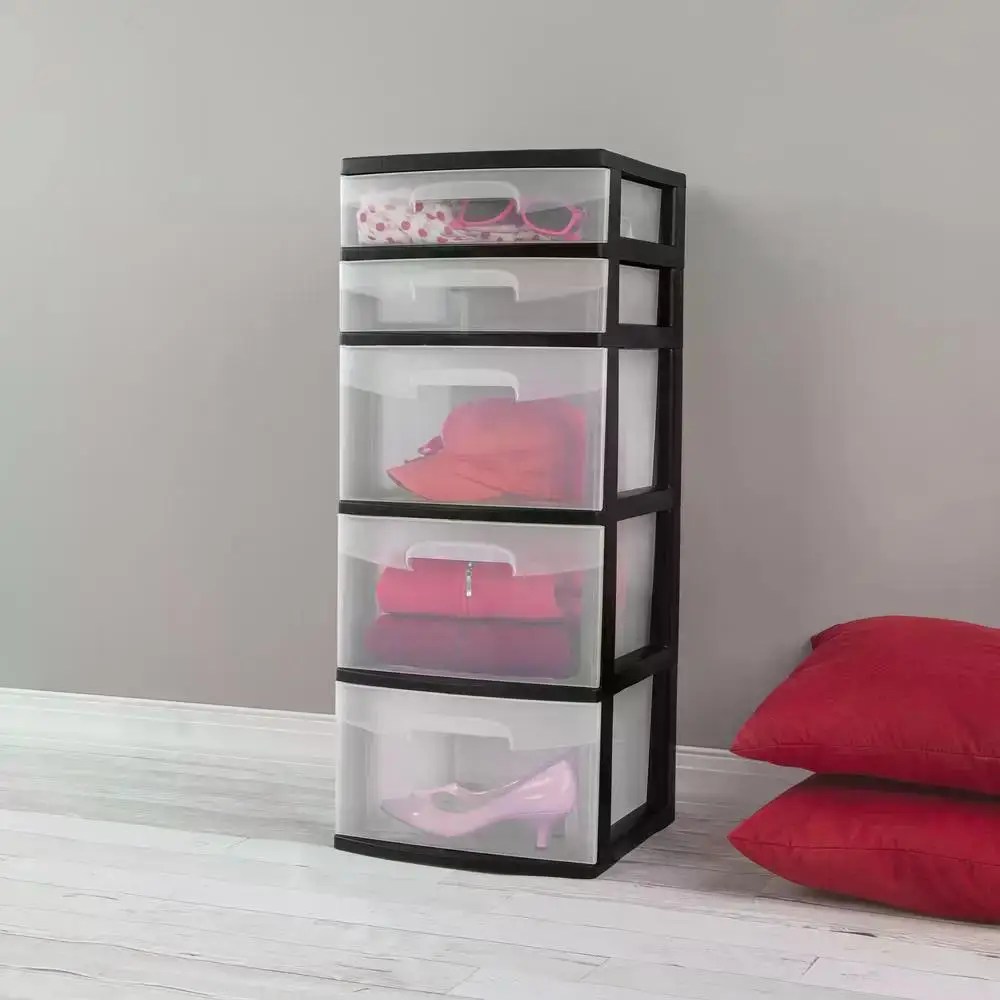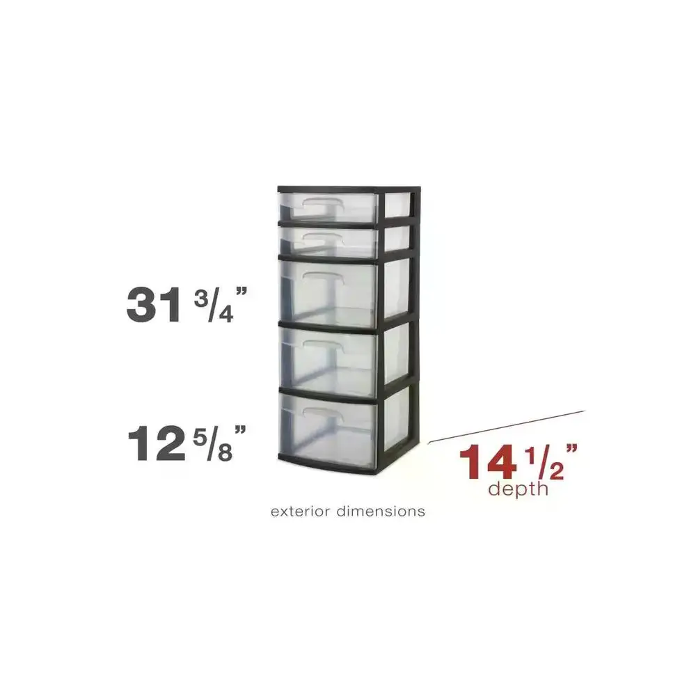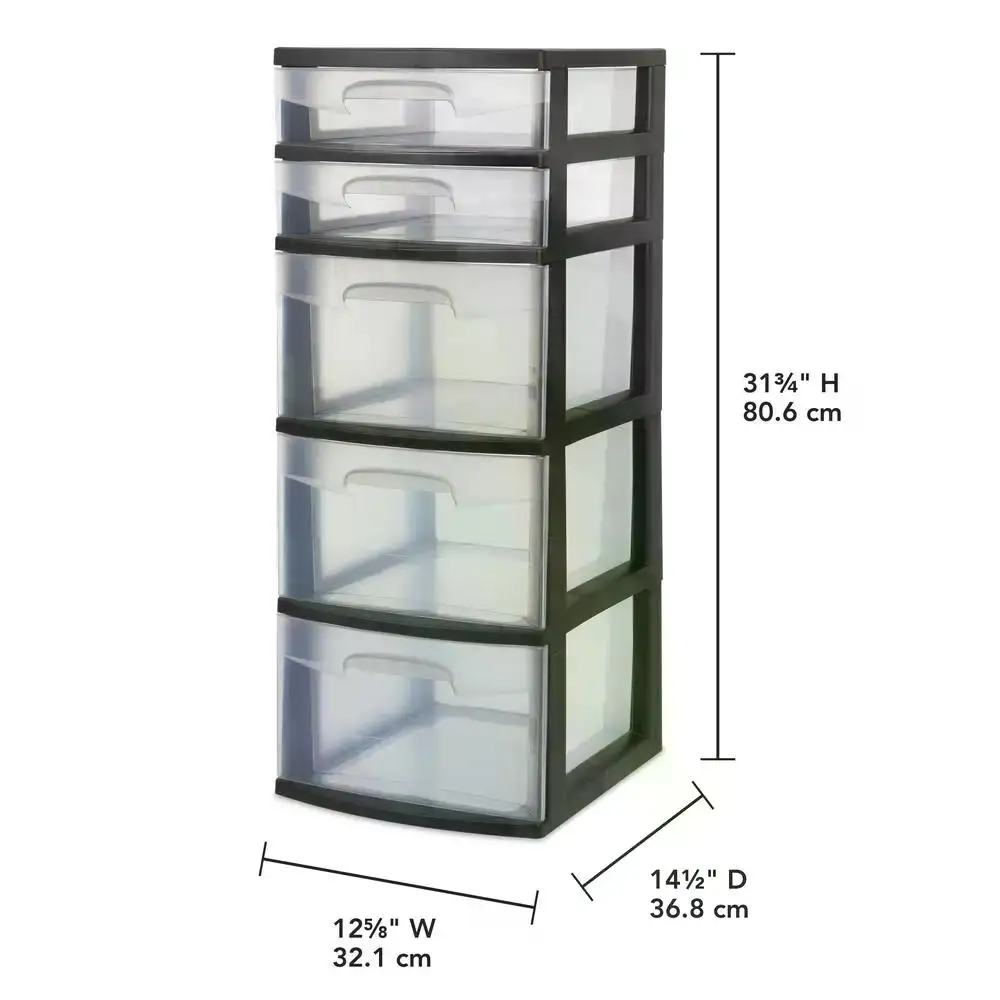 Storage tower. Black drawer tower is made with plastic construction. 5 large, clear drawers. Aesthetically pleasing black frame. Easy to open sliding drawers. Sterilite tower has a sleek 2-tone design. Versatile tower fits neatly into any room in the home. Dimensions: 14. 50" x 12. 62" x 31. 75". Goes nicely with a wide variety of furniture and accessories. Use in a child's room for toys, sports equipment and more Suitable in the bathroom for towels, shampoo, makeup or brushes Available in single or 2