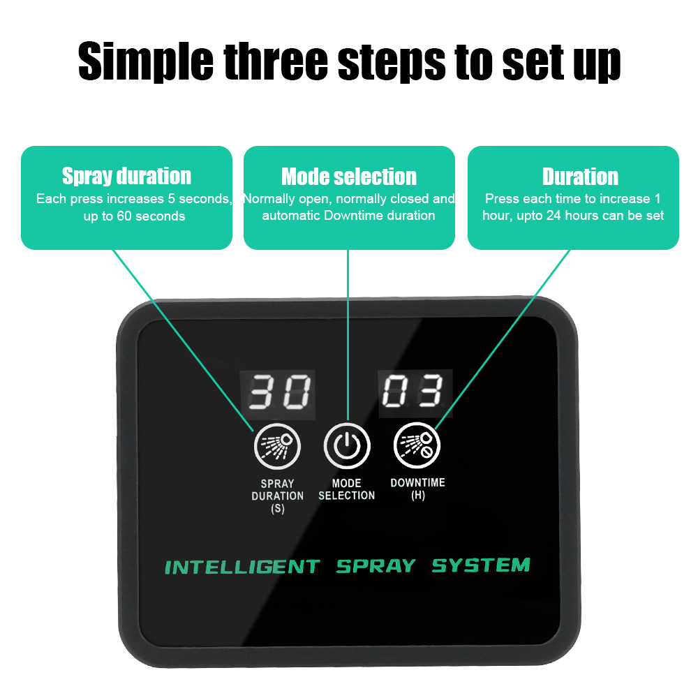 • Press (Spray Duration) 1 key to set the spray time, press once to increase 5 seconds, from 5s, 10s, 15-60s, so cycle