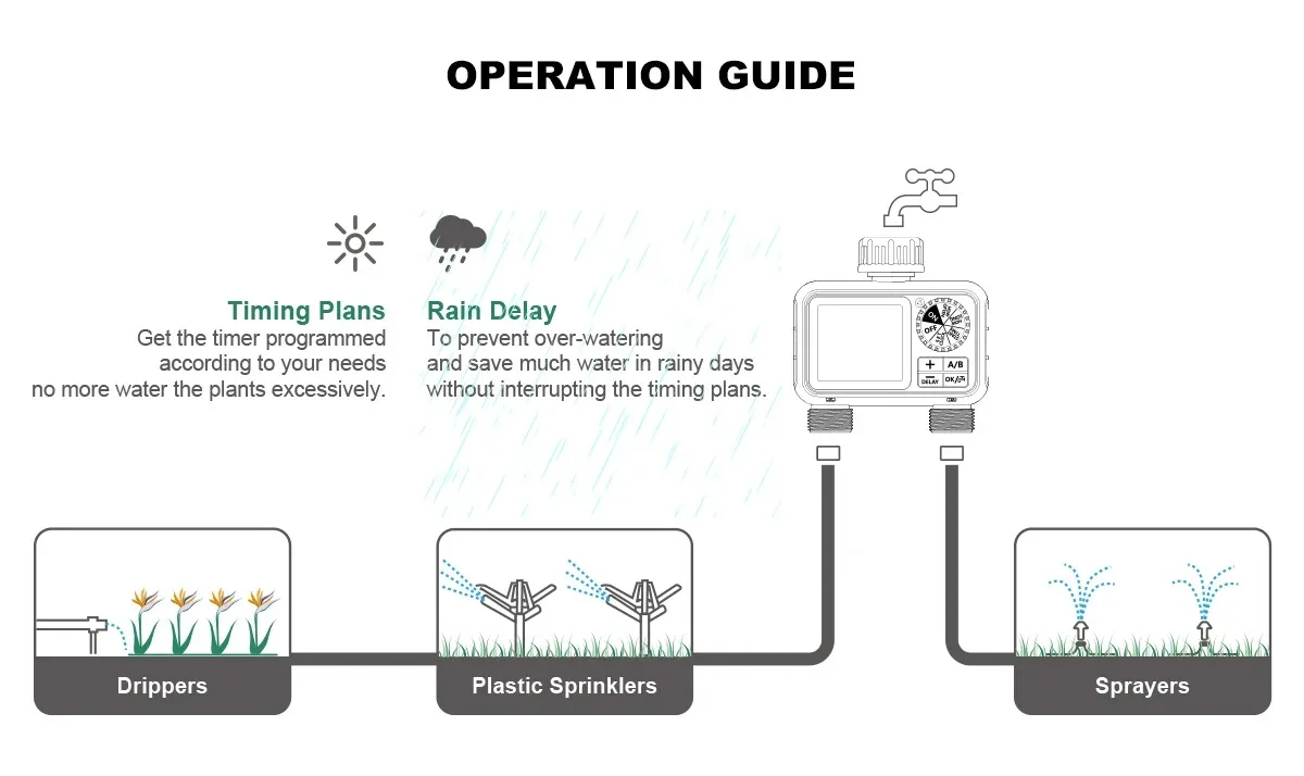 - LARGE DIGITAL DISPLAY: easy to read display can be seen at a distance- RAIN DELAY: save water by skipping watering cycles after it rains without interrupting your set program