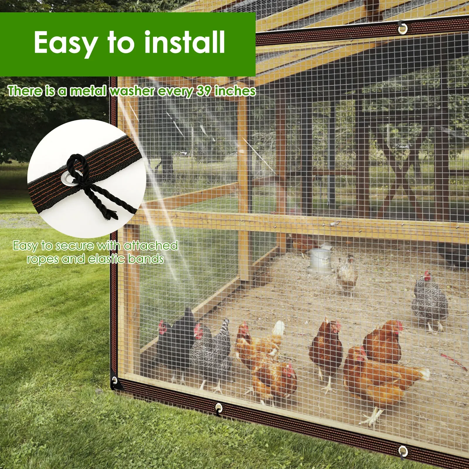 Enduring and Reliable: Our chicken coop tarp is crafted from enduring PE material, offering tear resistance and high transparency. It effectively protects against rain, snow, and harsh weather conditions