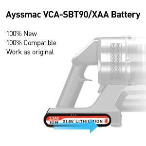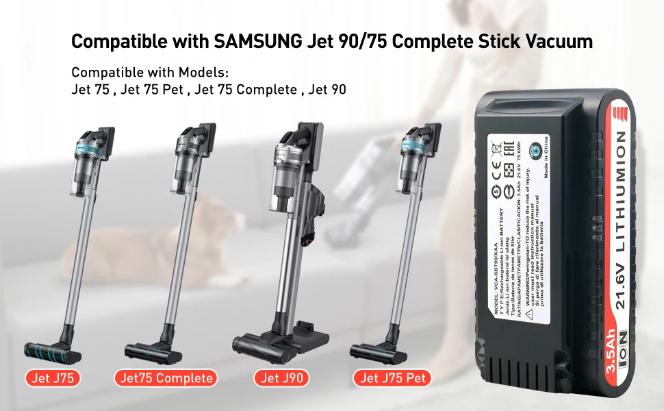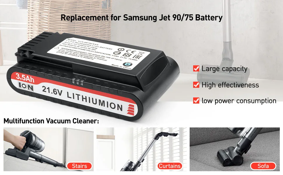 The battery has a capacity of 3.5Ah, which should provide sufficient power for extended use of your Samsung Jet vacuum.Compatible for Samsung jet 90 battery, for Samsung jet 75 battery, for SAMSUNG Jet 90/90+/90 pet/75/75+/75 pet Cordless Vacuum Cleaners,VCA-SBT90/XAA