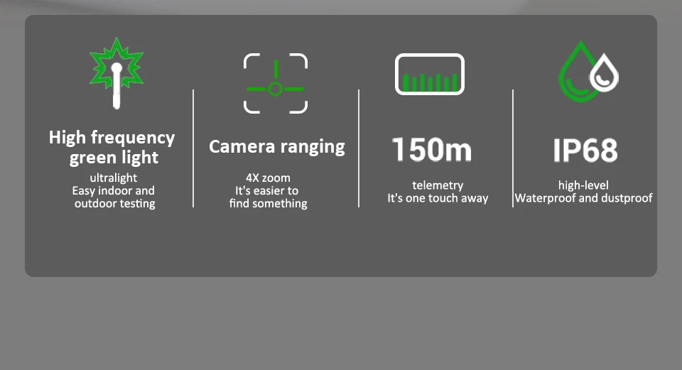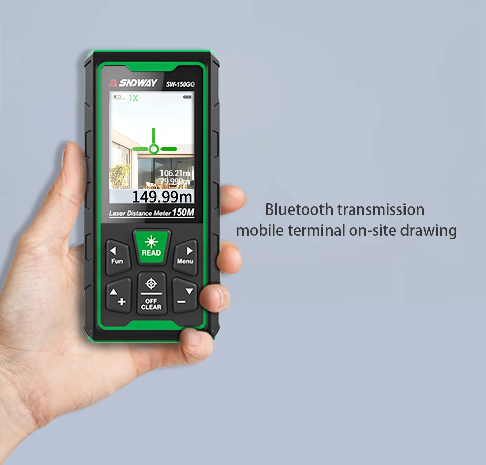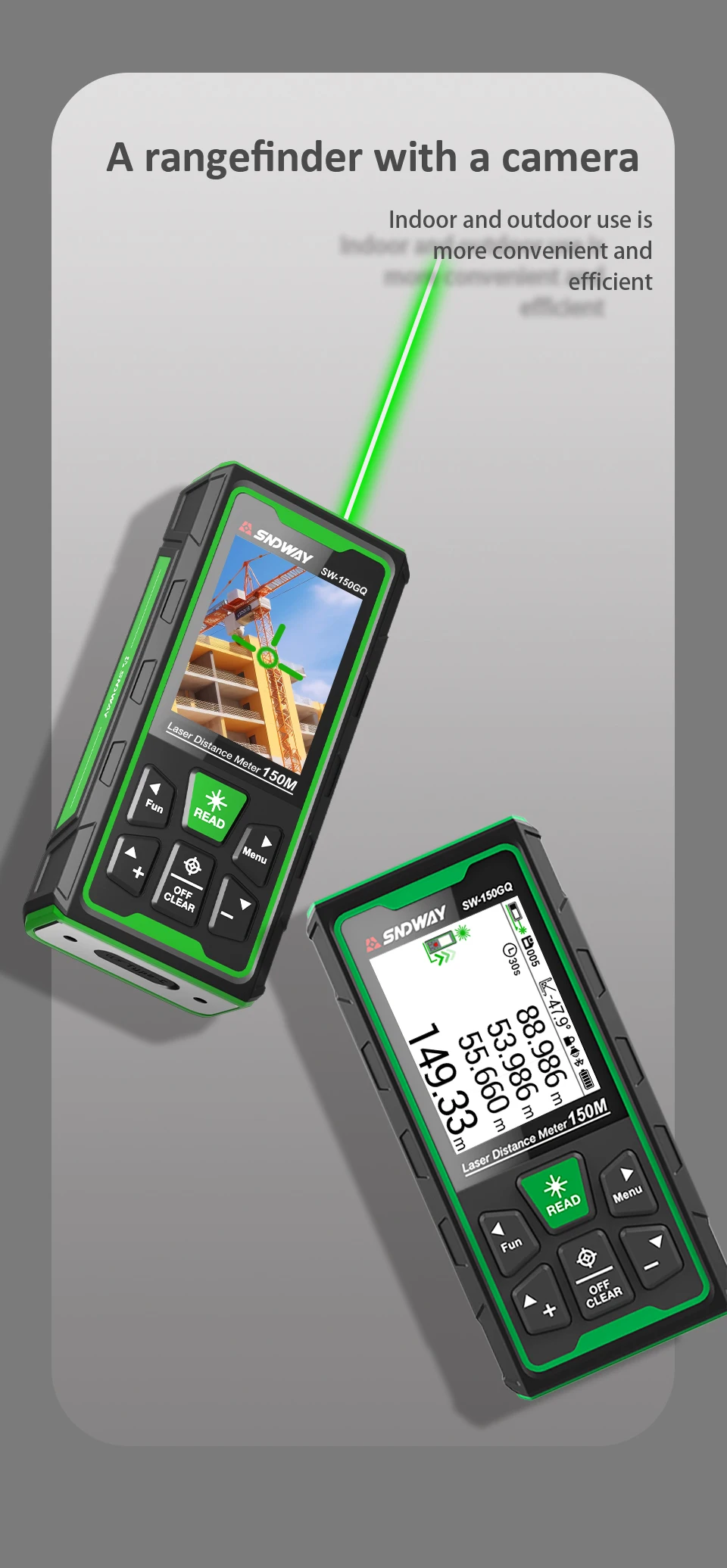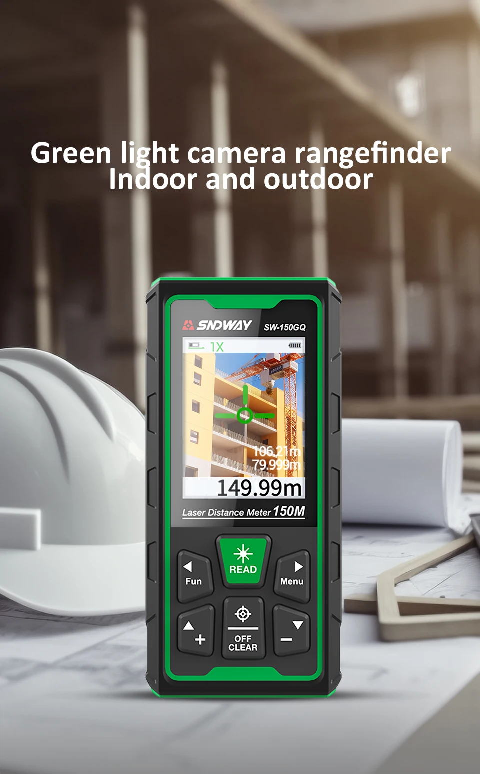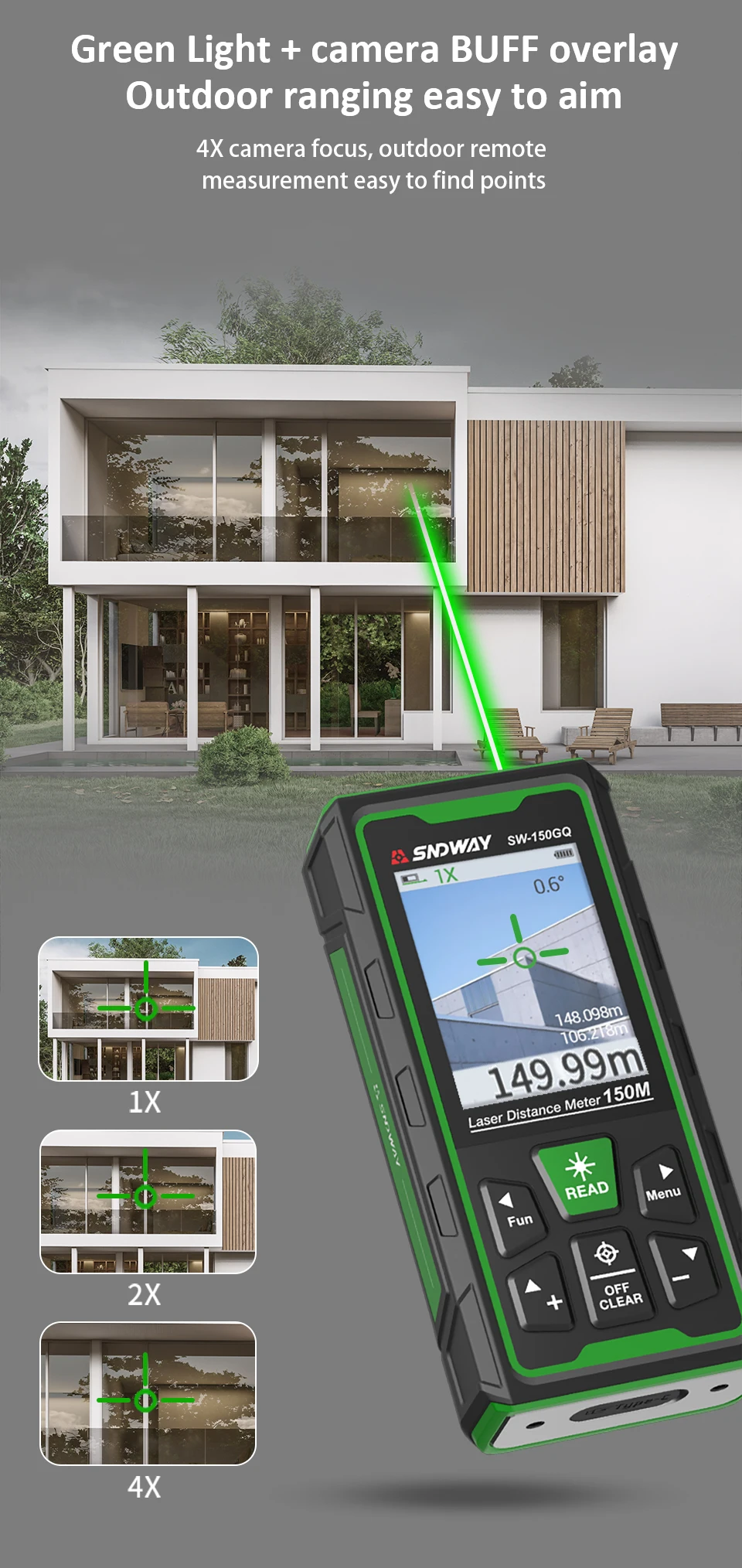 ●Easy remote measurement: Green light+camera BUFF overlay, 4X camera focus, easy to find points for outdoor measurement.