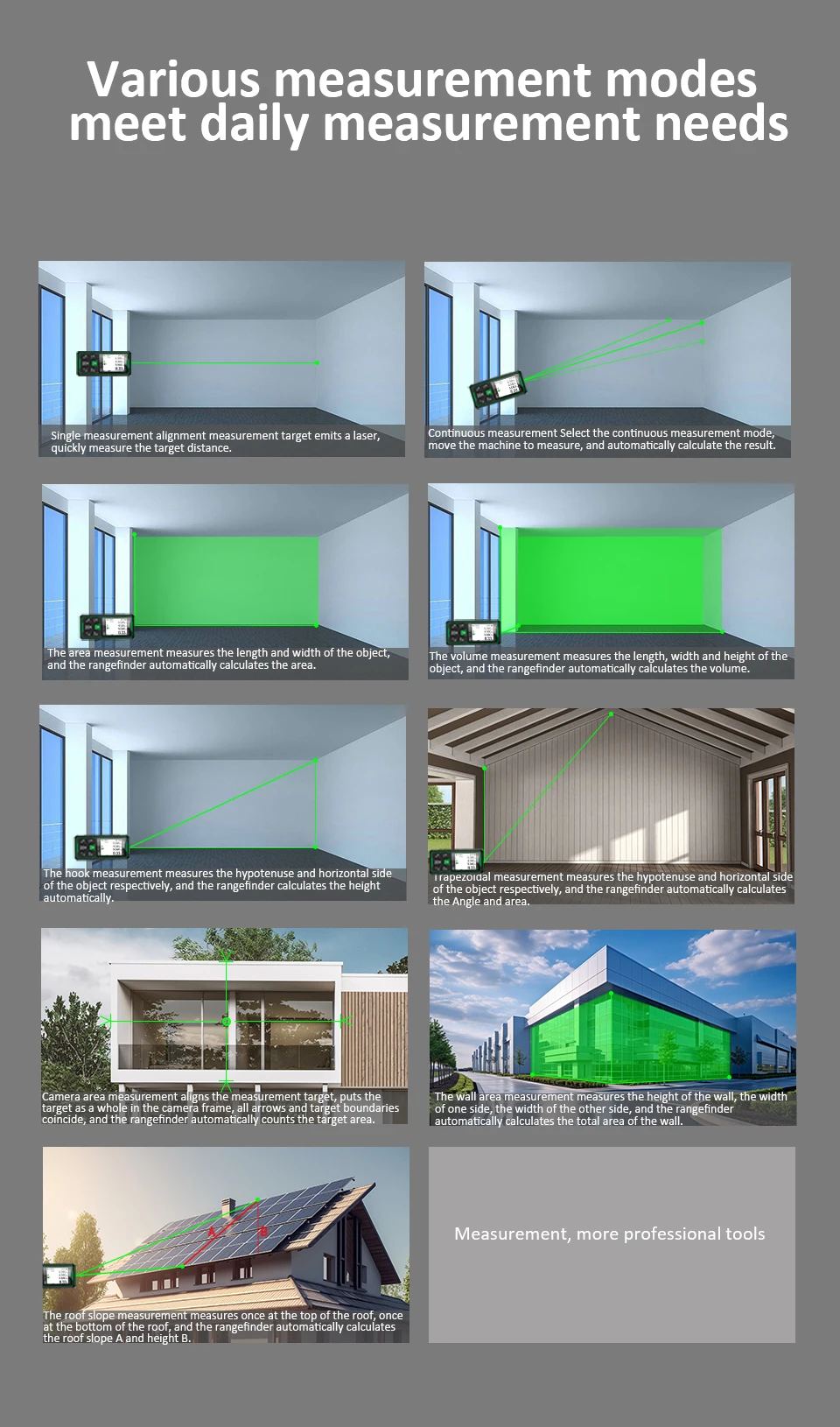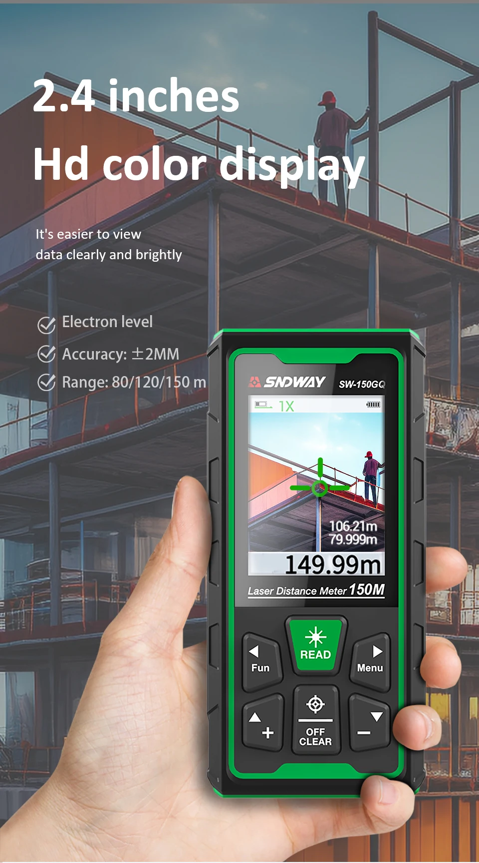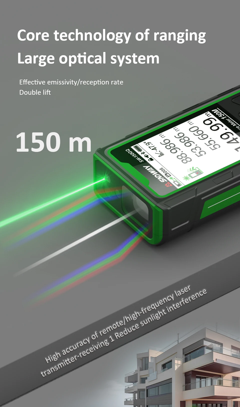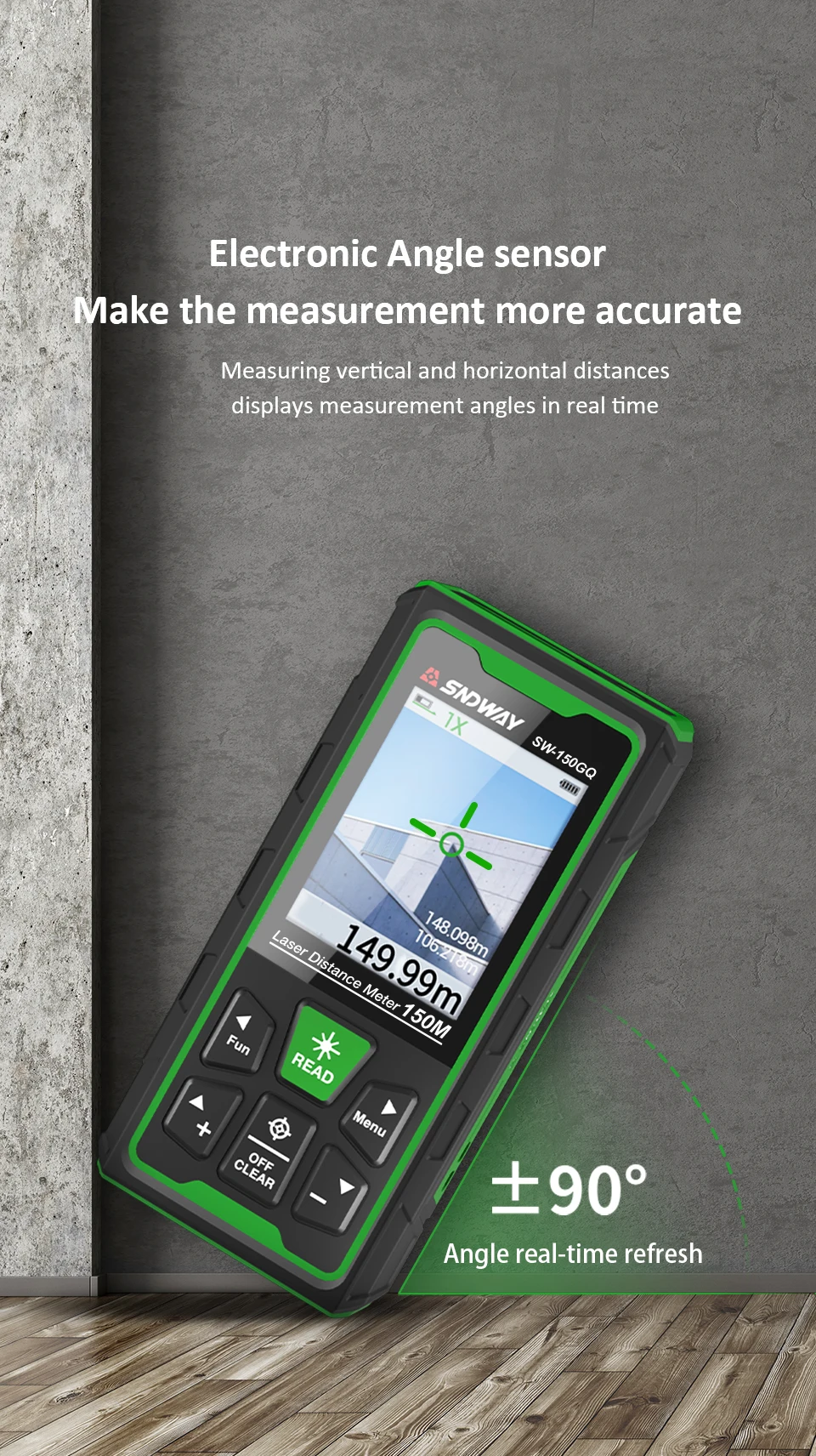 ●Easy remote measurement: Green light+camera BUFF overlay, 4X camera focus, easy to find points for outdoor measurement.