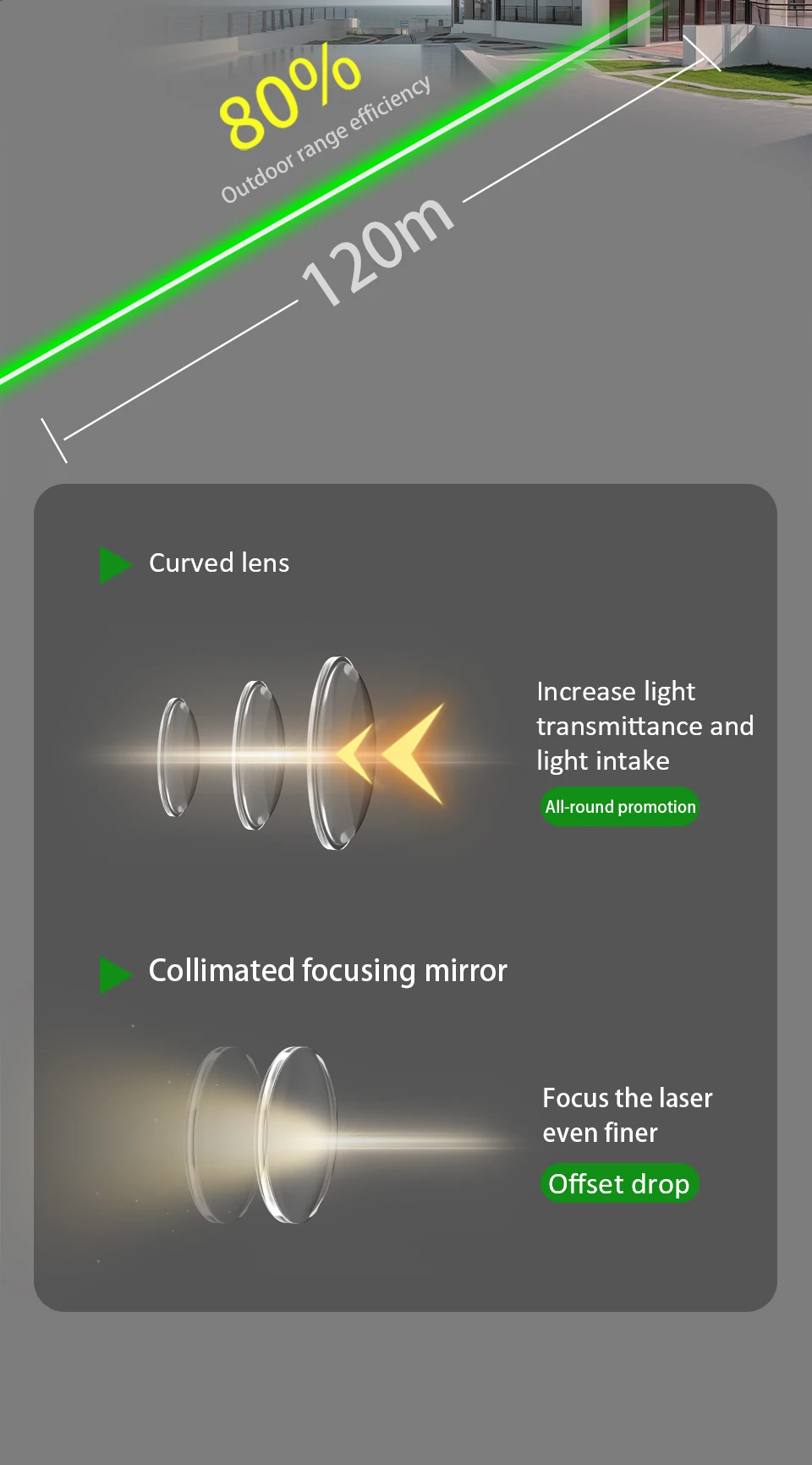 ●Scientific optical system: Curved lenses reduce sunlight interference, increase transmittance and light intake, and collimating focusing lenses focus laser to finer wavelengths, effectively improving emissivity and reception.