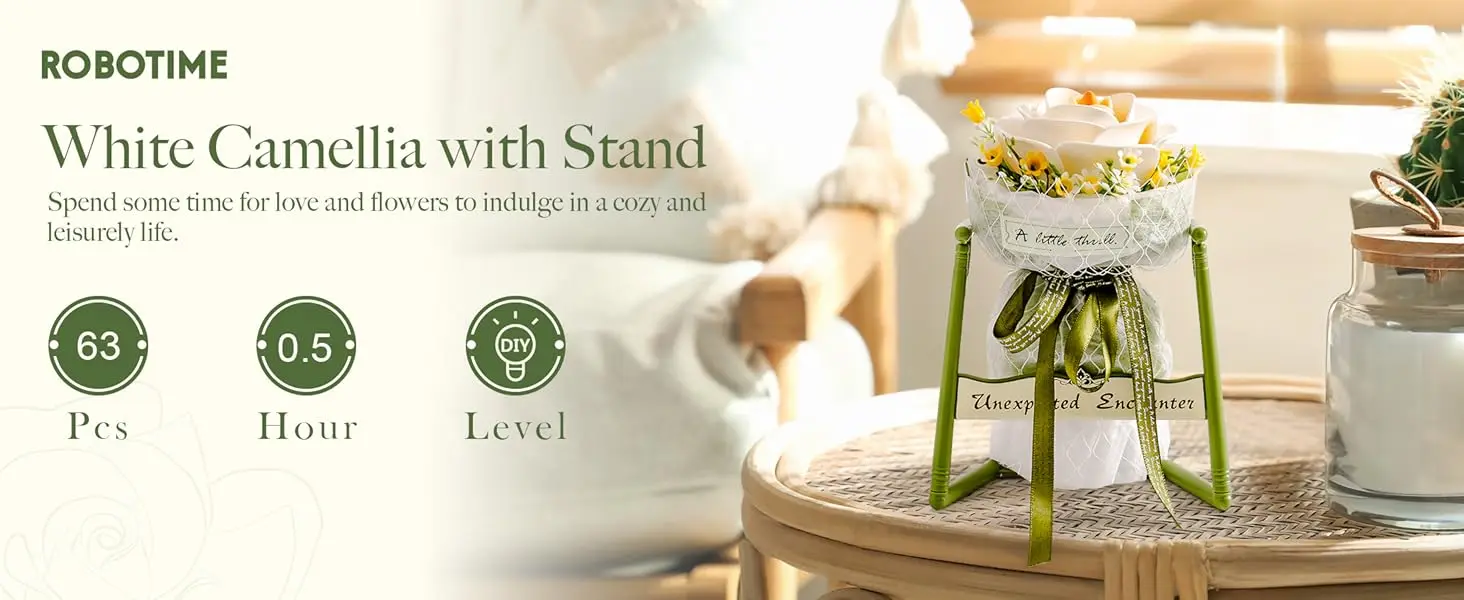 🌿 Graceful French-Inspired Design – The ROBOTIME AF011 3D Flower Model Kit captures the essence of French elegance with its exquisite floral stand. A harmonious blend of cream-white tones and lush greenery allows the flowers and leaves to unfurl beautifully, creating a romantic and serene ambiance.