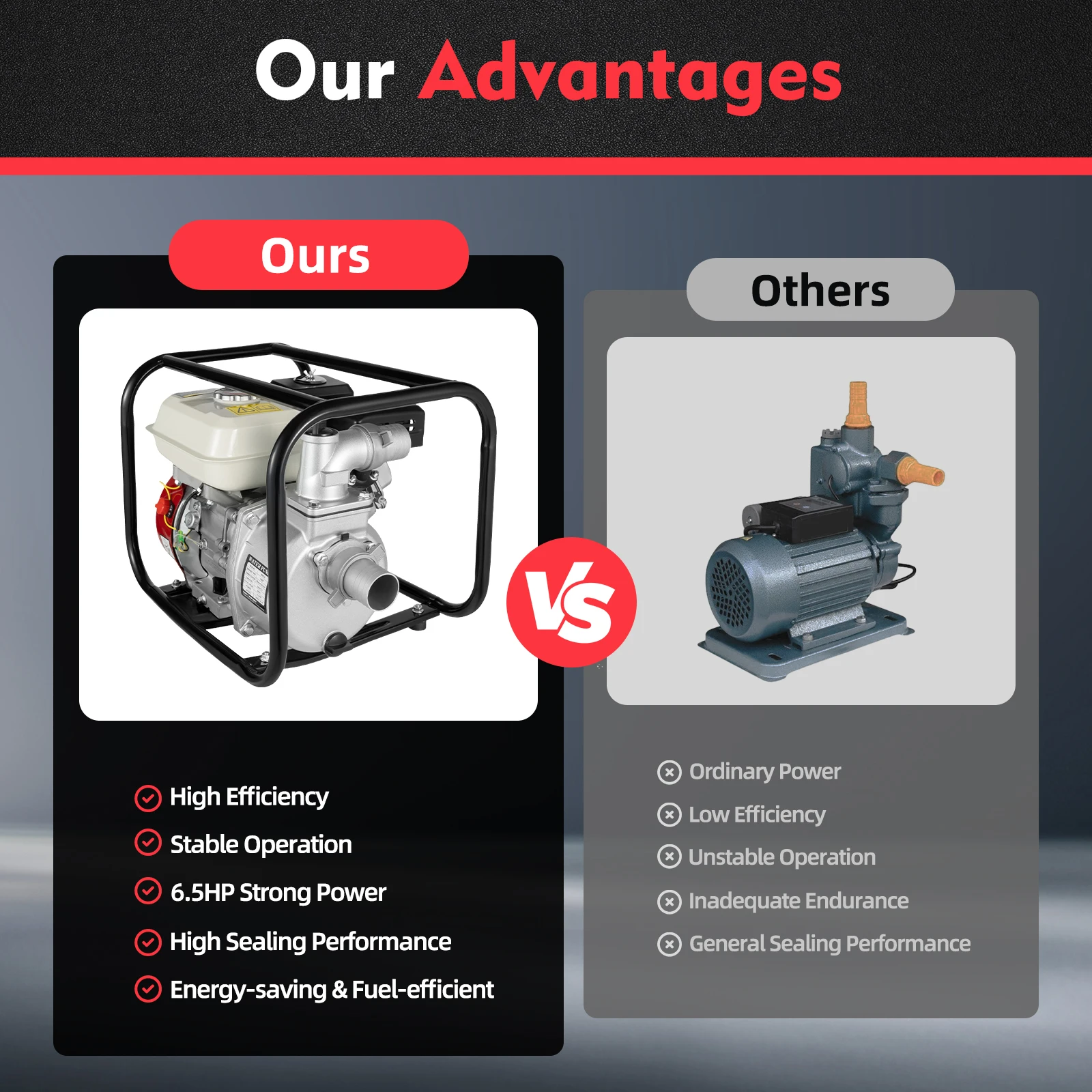 High Efficiency: It adopts a powerful four-stroke OHV engine, which can generate more power. The 6.5hp, 210cc engine has a high speed of 3600r/min, achieving a 1271.33ft³/h hourly flow rate, 23ft self suction height, and 92ft lift. and efficiently completing various irrigation and drainage tasks in a shorter amount of time.