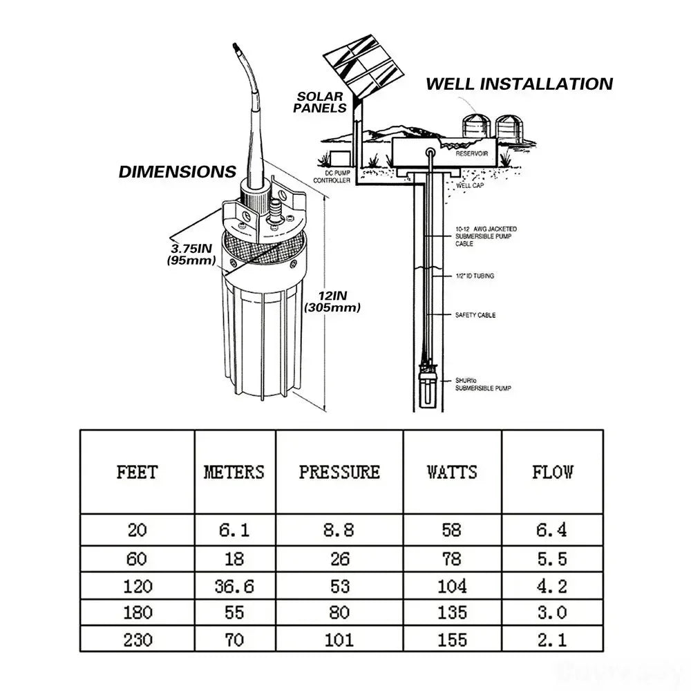 The solution to your remote water pumping needs. This pump is rugged, durable and built to last. This pump delivers a steady 103 GPH (390 LPH) at its maximum depth of 230 feet (70M) when supplied with 24 VDC. Its unique water-tight power connector stops water wicking and prevents potential condensation problems. Great for livestock watering, irrigation, pond aeration, remote homes and cabins.