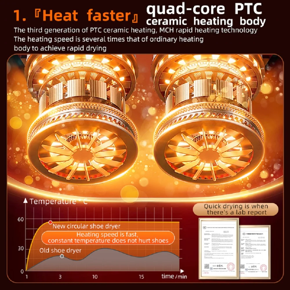 4.Quick cycle drying shoes. 360 ° surround heat circulation warm air agitation, faster heating, uniform drying, no longer afraid of drying before and after the wet, the whole shoe full drying.