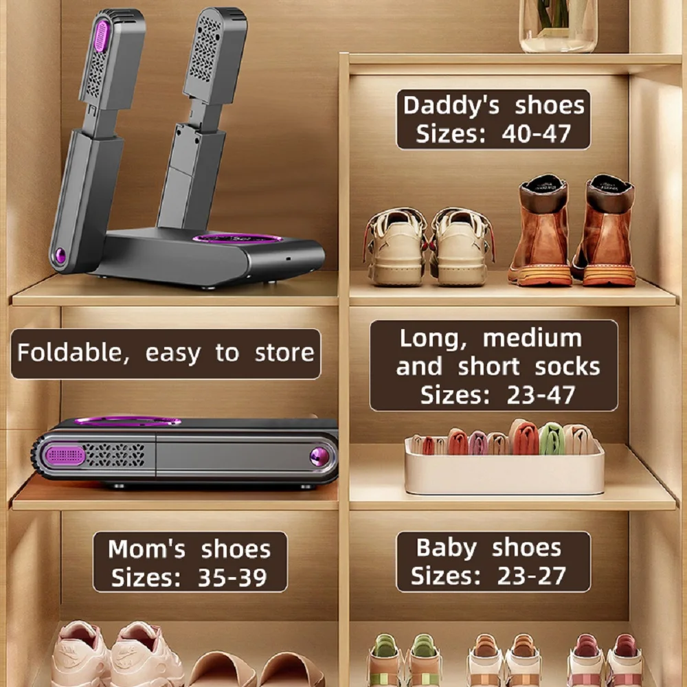 7.No size limit. Automatic telescopic sliding bar design, suitable for all sizes of shoes and socks, not picking shoes, drying the whole family shoes and socks