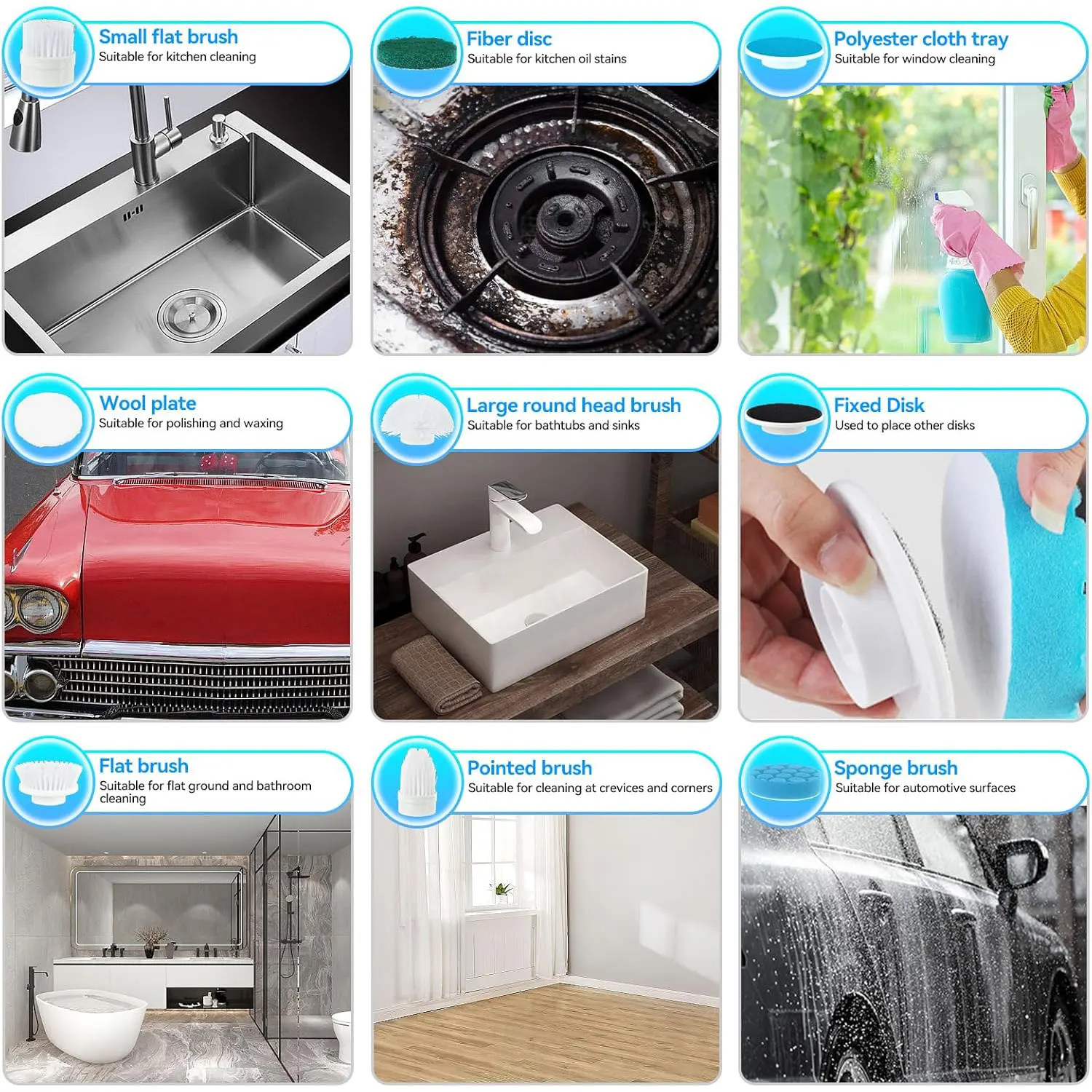 【9 Multi-Purpose Brush Heads】Includes 9 replaceable cleaning brushes for various scenarios. Flat brush for surfaces like tile floor, wall, and pool; corner brush is excellent for cleaning grout, faucets, and edges; cloth brush for wooden floor and furniture cleaning; the sponge is for the window. This brush also be used for car washing, too.
