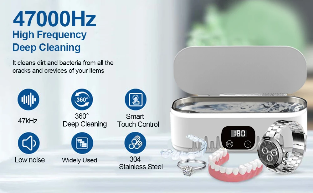 dvanced ultrasonic technology: Our ultrasonic cleaner operates at a frequency of 47,000 Hz, 18W. Harnessing the power of cavitation, it effectively removes surface dirt from items without damaging them.