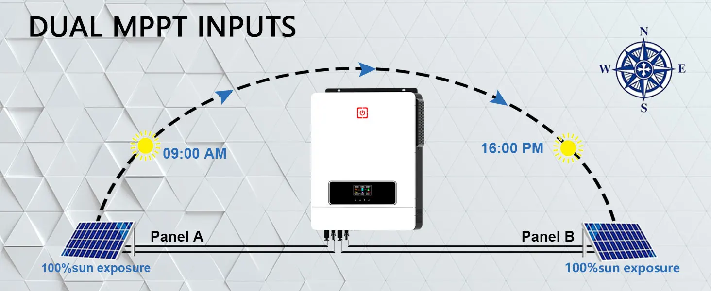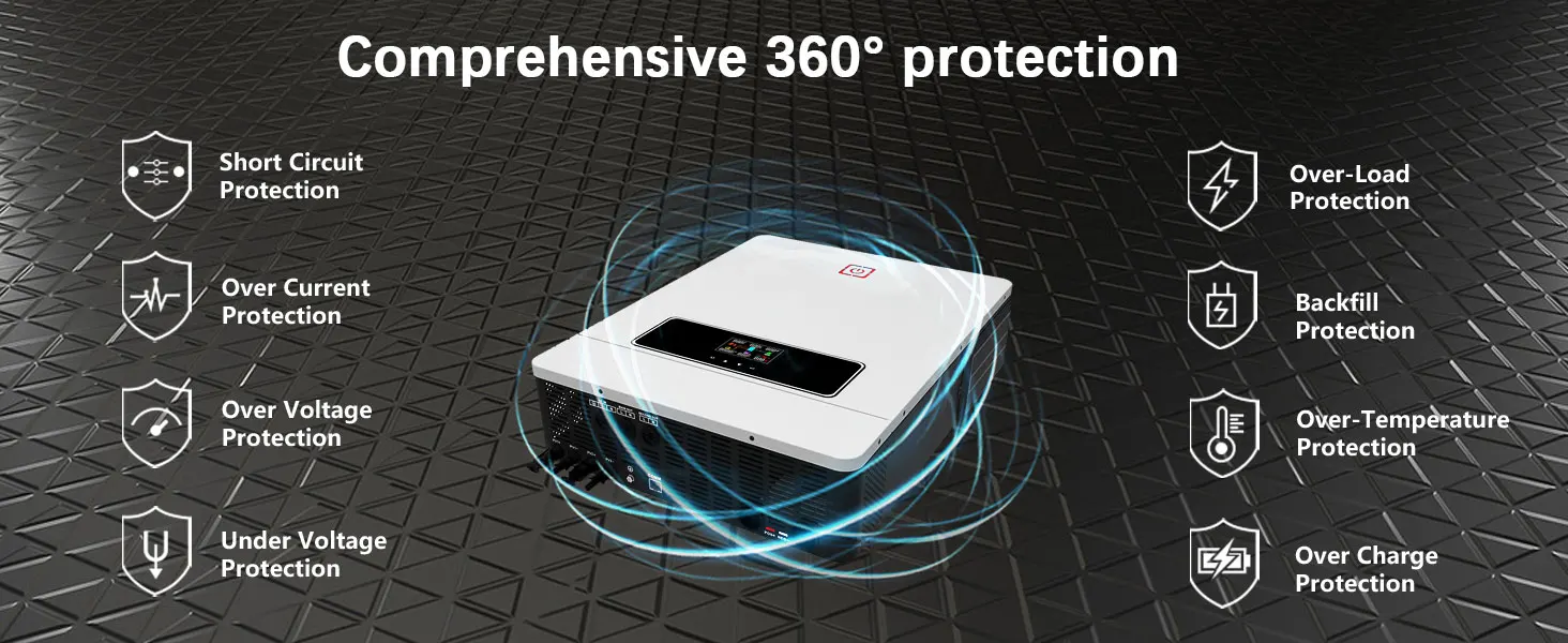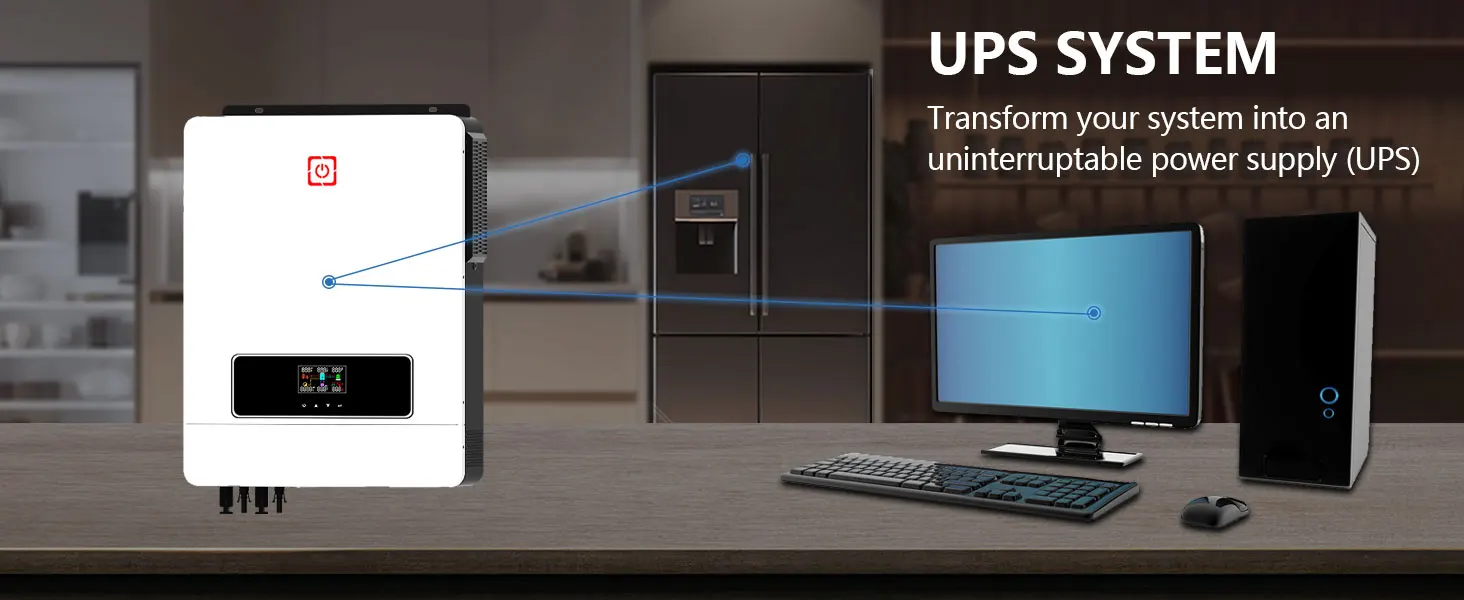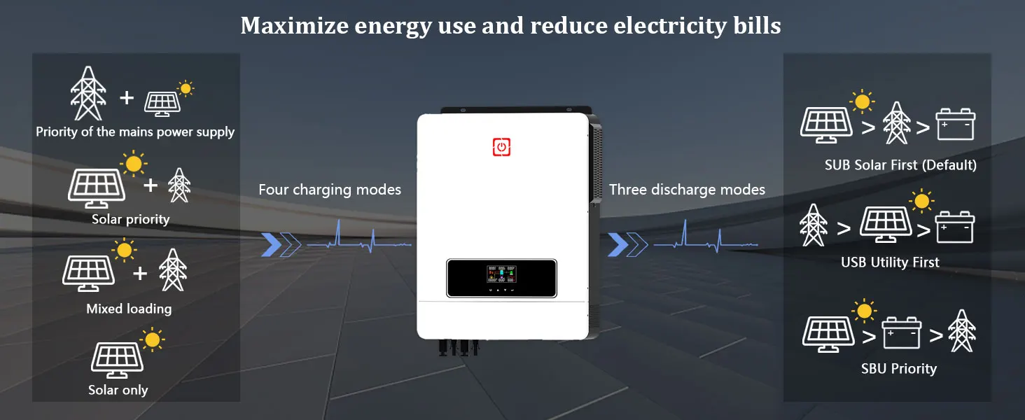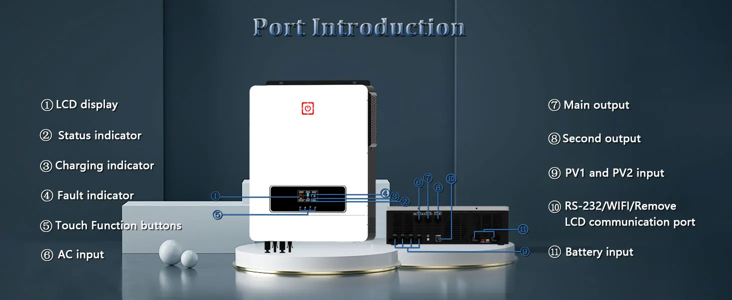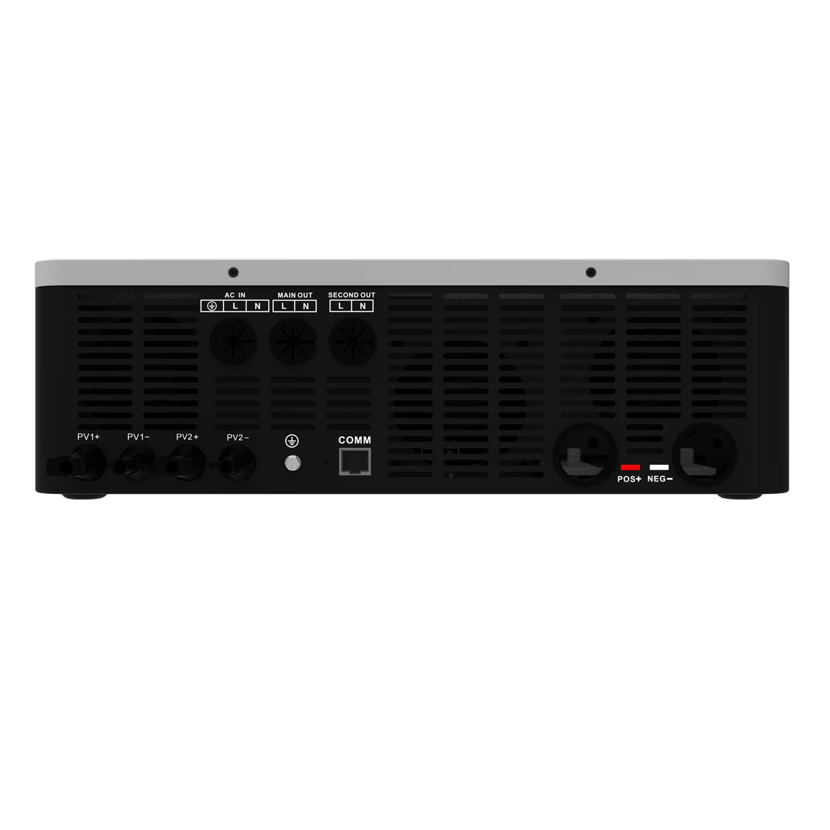Dual AC output: under normal conditions, the main circuit and secondary circuit outputs are used normally. When there is no PV and mains power input and the battery voltage is too low, the main circuit is disconnected and only the secondary circuit output is retained to save power.