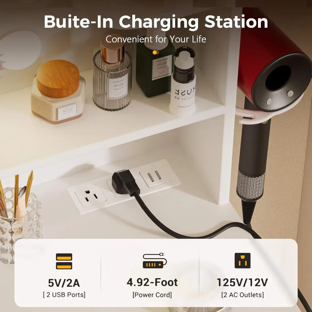 • 【Built-in Charging Station】This modern makeup desk is equipped with 2 standard plug sockets and 2 USB ports, allowing you to use your hair dryer or curling iron more conveniently while applying make-up, as well as charging your cell phone, tablet, or other electronic devices for taking selfies or live streaming more easily
