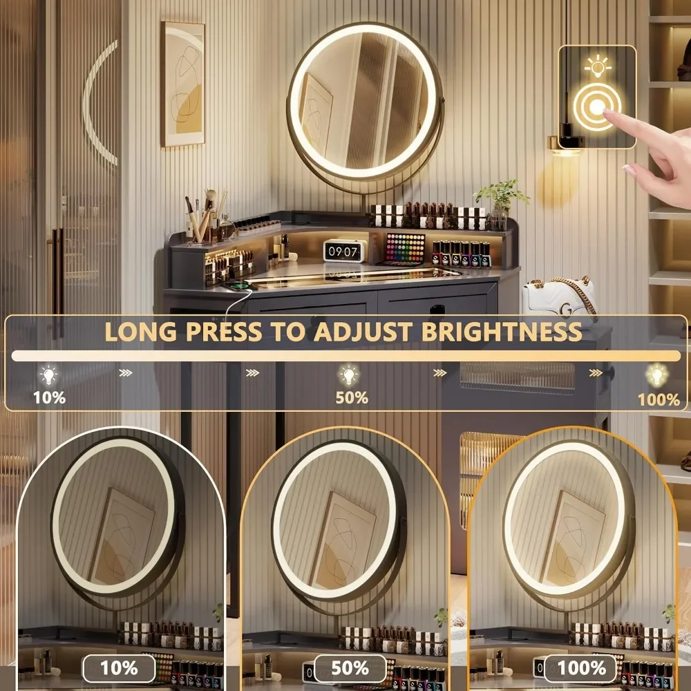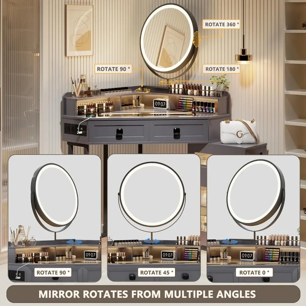 Corner Vanity with Mirror and Lights,Modern Makeup Vanity Set with Power Outlet,Large Storage Dressing Table with Drawers