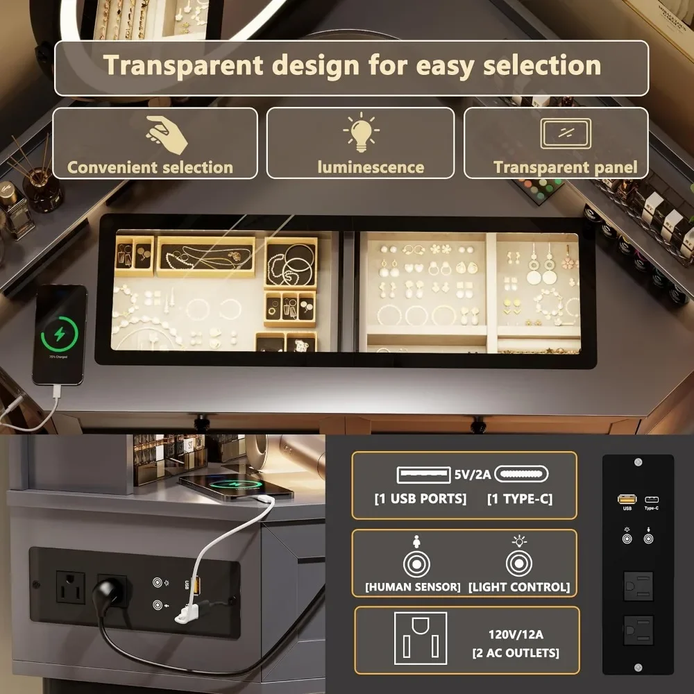 Makeup Vanity with Power Outlet&Human Sensor: Modern Dressing table with 1x USB port, 1x Type-C,2 x Outlets Ports , easily charge your electronics without having to search for a separate power source,Vanity with human sensor lights, auto lights ON when detect human approach during 2-3M