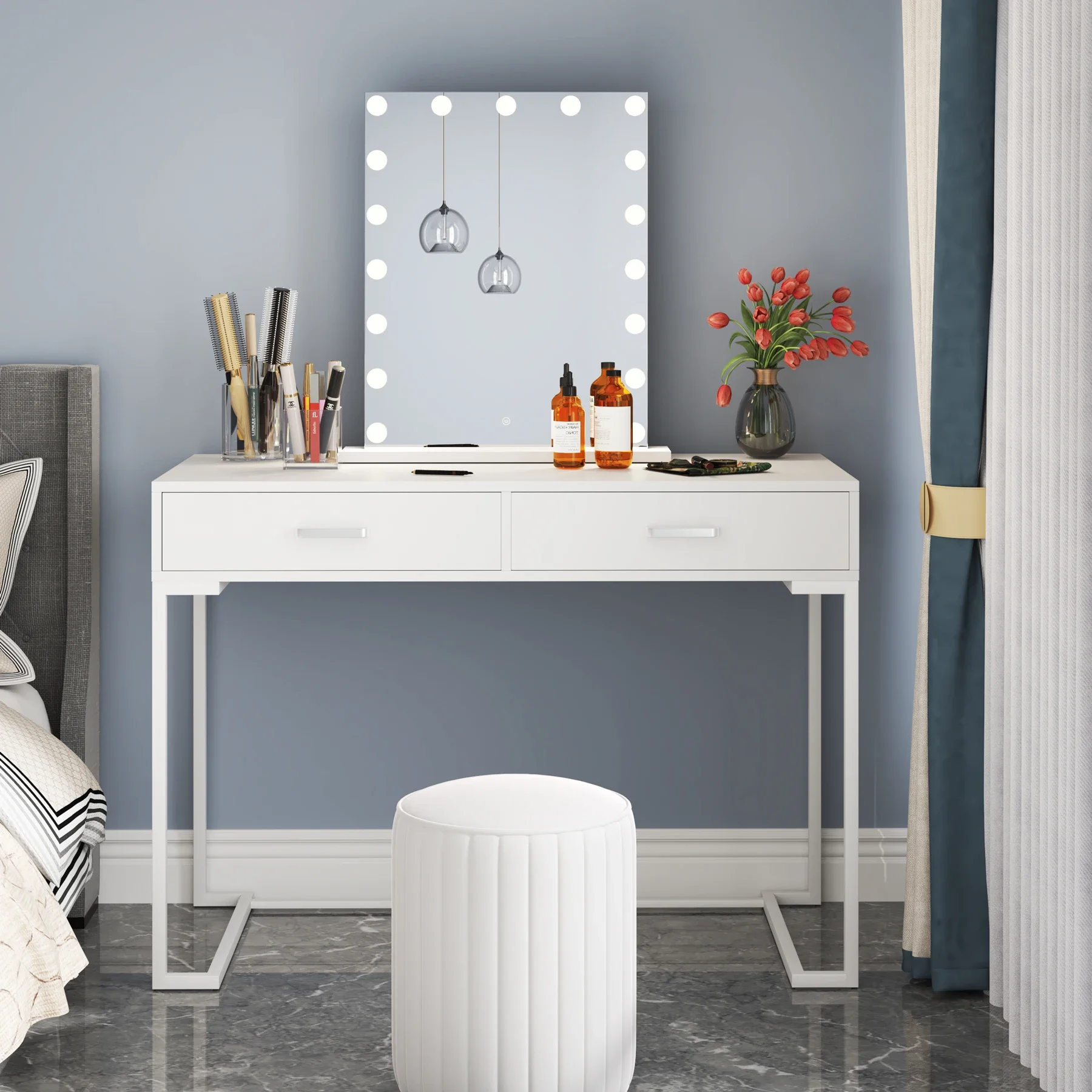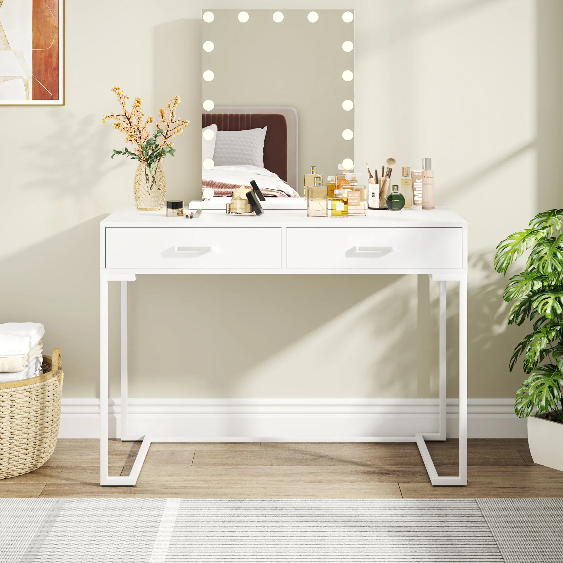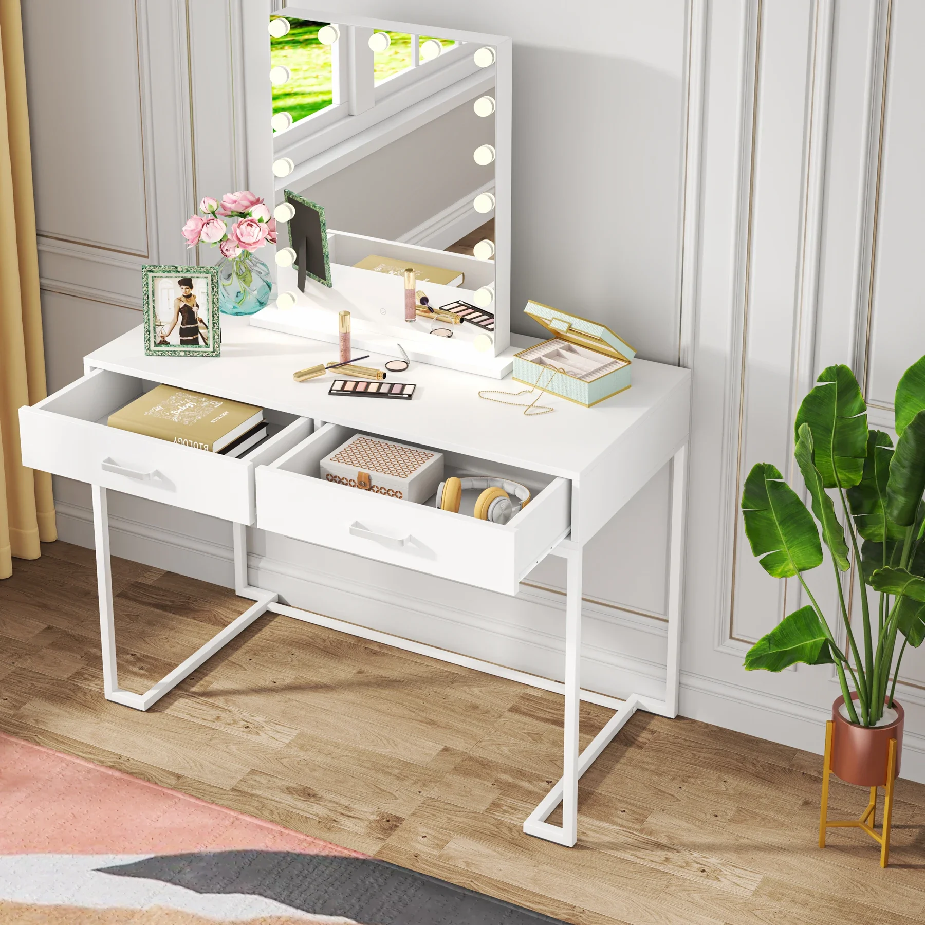 【2 WIDE DRAWERS】: 20" in length and 3.1" in depth, provide you with private room to hold your notebooks, papers, files, documents, and other office supplies or makeup stuffs. Paired with golden handles for easy access.